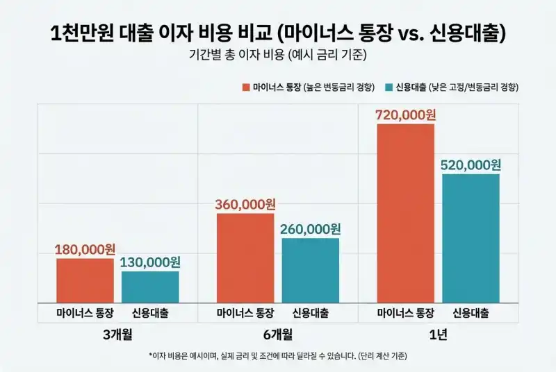 마이너스통장 vs 신용대출 금리 한도 완벽 비교. 연 5~7% vs 4~6%, 1천만원 6개월 이자 실제 계산, 단기 소액은 마이너스 장기 목돈은 신용대출. 상황별 선택 전략으로 이자 절약