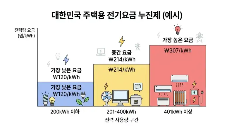 우리나라 주택용 전기요금에는 3단계 누진제가 적용됩니다. 쓰면 쓸수록 kWh당 단가가 올라가는 구조예요. 1단계에서 kWh당 112원이던 게 3단계에 들어서면 299.3원까지 치솟으니까, 같은 양을 써도 어느 구간에 걸리느냐에 따라 요금이 확 달라지는 거죠.