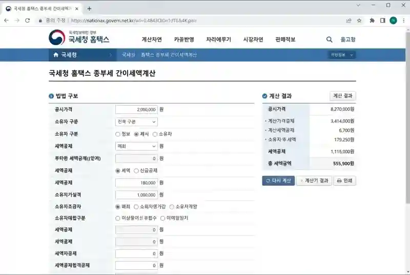 어떤 게 유리할지는 주택 가격, 나이, 보유기간에 따라 달라져요. 국세청 홈택스의 ‘종합부동산세 간이세액계산’ 서비스를 이용하면 두 방식을 비교해볼 수 있답니다.