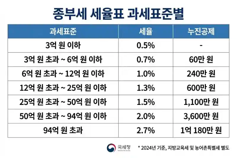 종부세가 무겁게 느껴지는 이유는 누진세율 구조 때문이에요. 과세표준이 높아질수록 세율도 가파르게 올라가거든요. 2주택 이하는 0.5%~2.7%, 3주택 이상은 최대 5%까지 적용돼요.