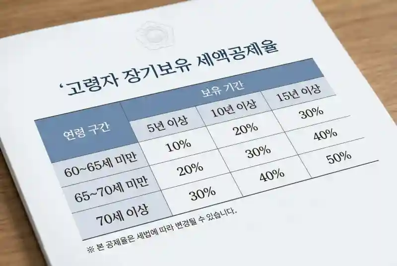 고령자 세액공제는 만 60세 이상 20%, 만 65세 이상 30%, 만 70세 이상이면 40%를 공제받아요. 장기보유 세액공제는 5년 이상 20%, 10년 이상 40%, 15년 이상이면 50%예요.