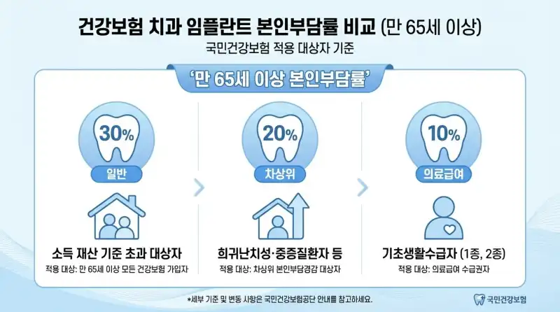 임플란트 건강보험 핵심은 세 줄로 요약돼요. 만 65세 이상, 부분 무치악, 평생 2개. 본인부담금 30%면 1개당 약 38~40만 원이고, 의료급여 수급자는 더 낮아요.