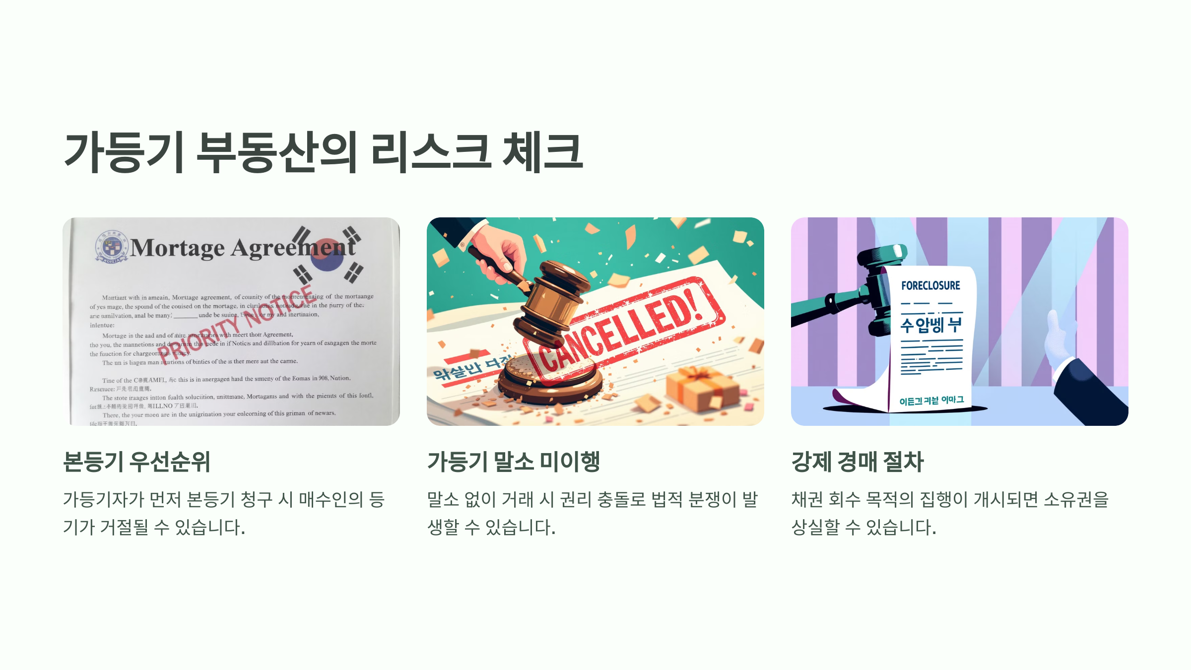 가장 큰 리스크는 ‘가등기 권리자의 본등기 전환’이에요. 매수인이 아무리 빨리 등기를 하더라도, 가등기자가 먼저 본등기 청구를 하면 매수인의 권리는 밀리게 돼요. 특히 가등기일이 오래된 경우일수록 우선순위가 강해요.