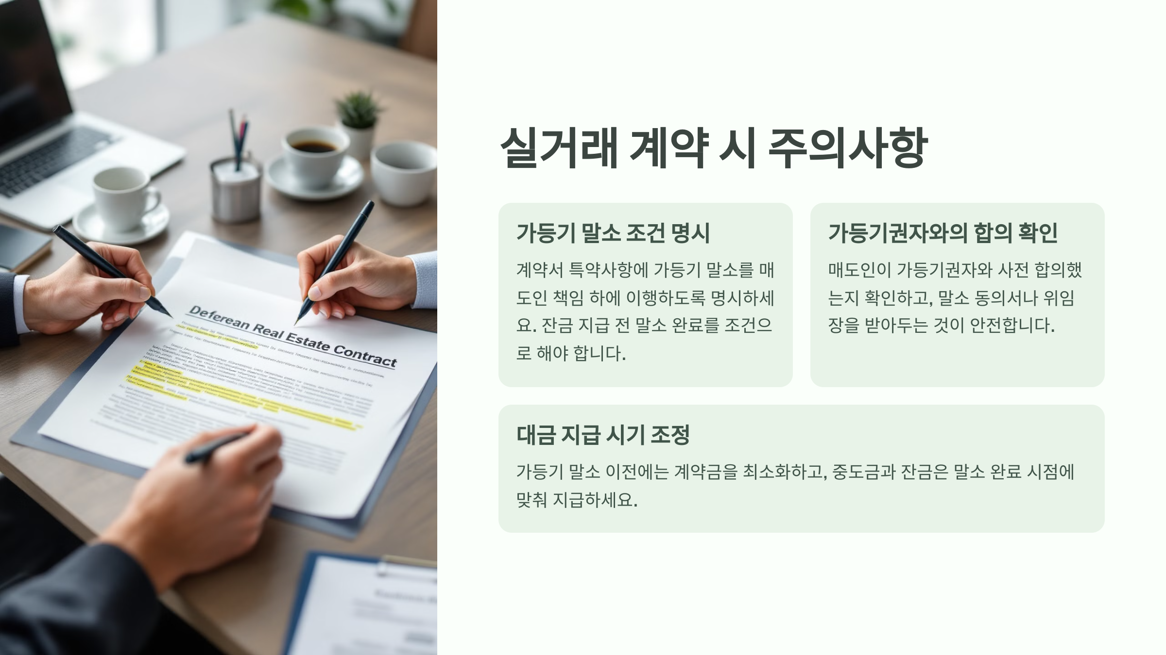 가장 중요한 건 ‘가등기 말소 조건 명시’예요. 계약서 특약사항에 반드시 가등기 말소를 매도인의 책임 하에 이행하도록 하고, 잔금 지급 전에 가등기 말소가 완료돼야 한다는 점을 명확하게 적어야 해요. 이 조항이 없다면 말소가 안 된 상태로 잔금을 지급하게 되는 위험에 처할 수 있어요.