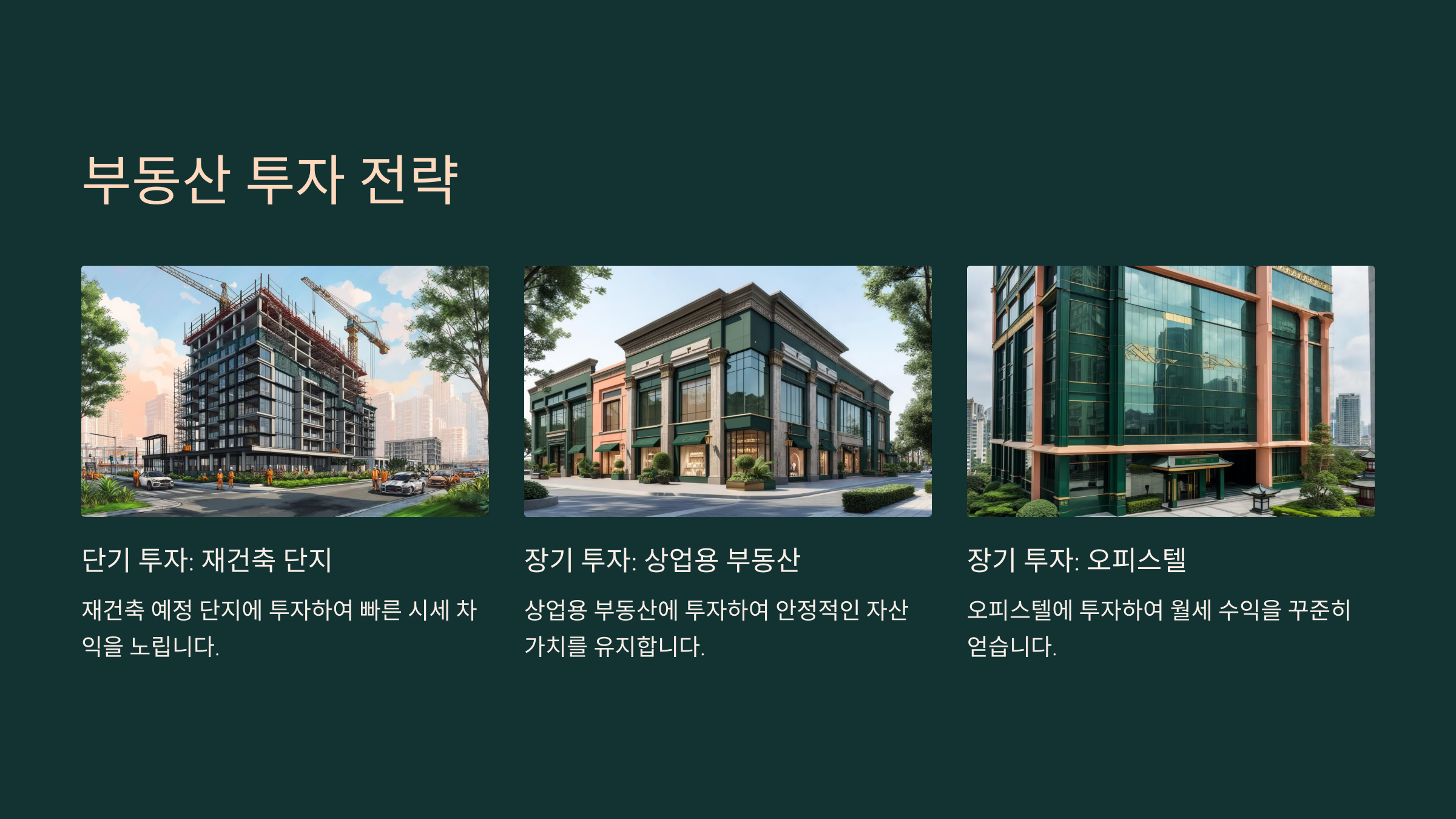 - 재건축 예정 단지나 개발 호재가 있는 지역에 투자해 시세 차익을 노려보세요.