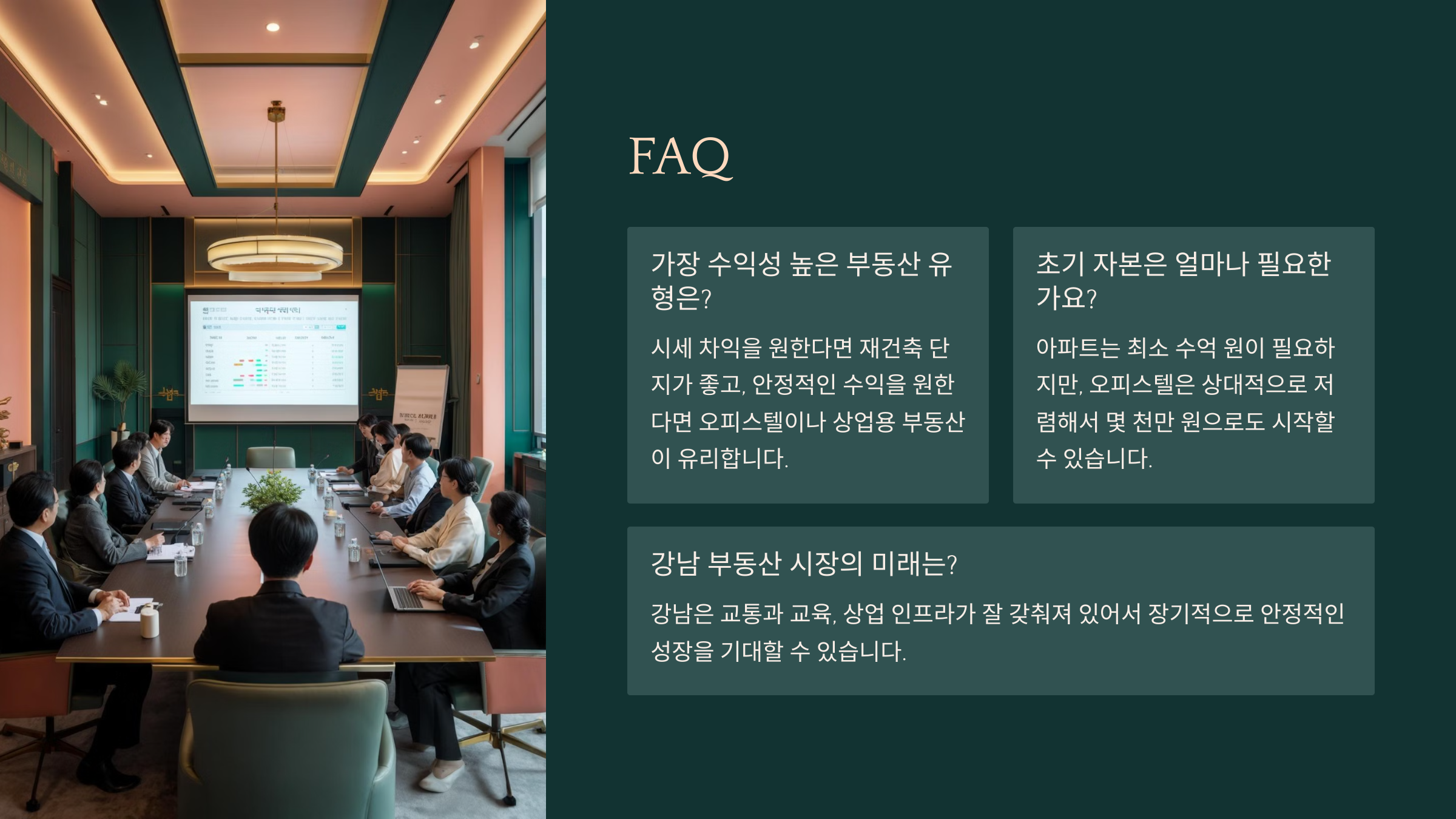 | 상업용 부동산 | 강남의 상권은 안정적인 임대 수익을 제공해요. | ★★★★☆ |