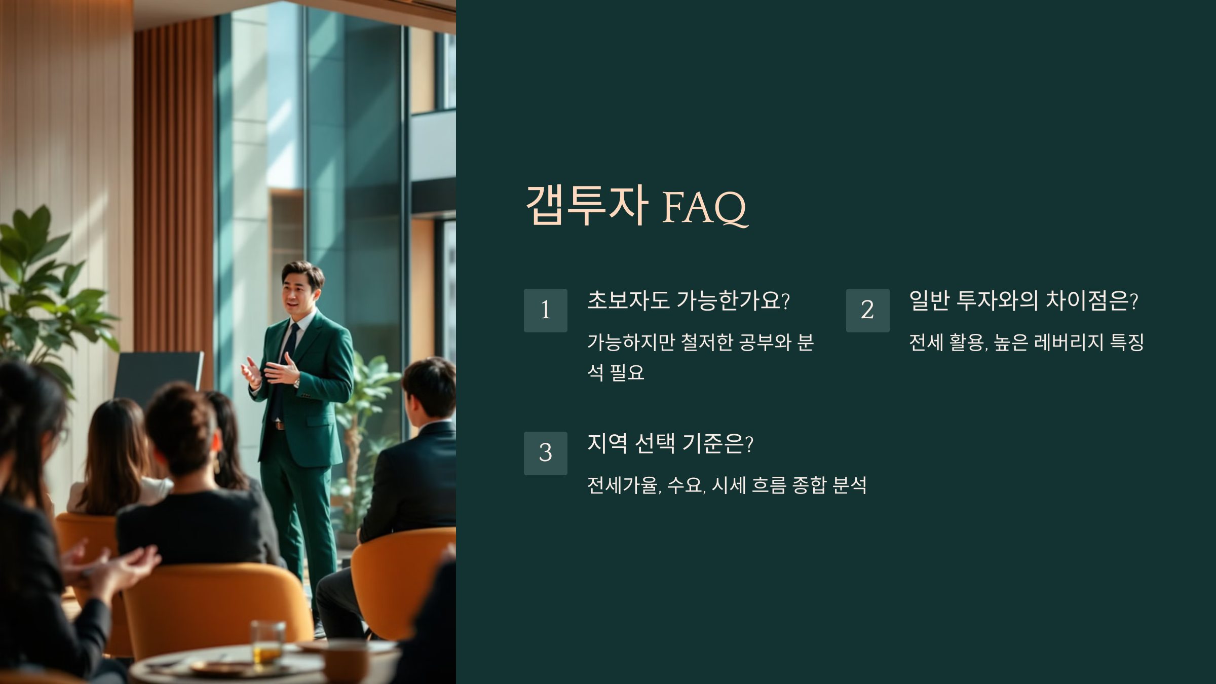 A2. 갭투자는 전세를 활용해 적은 자본으로 투자하는 방식이고, 일반 투자보다 레버리지가 높아요.