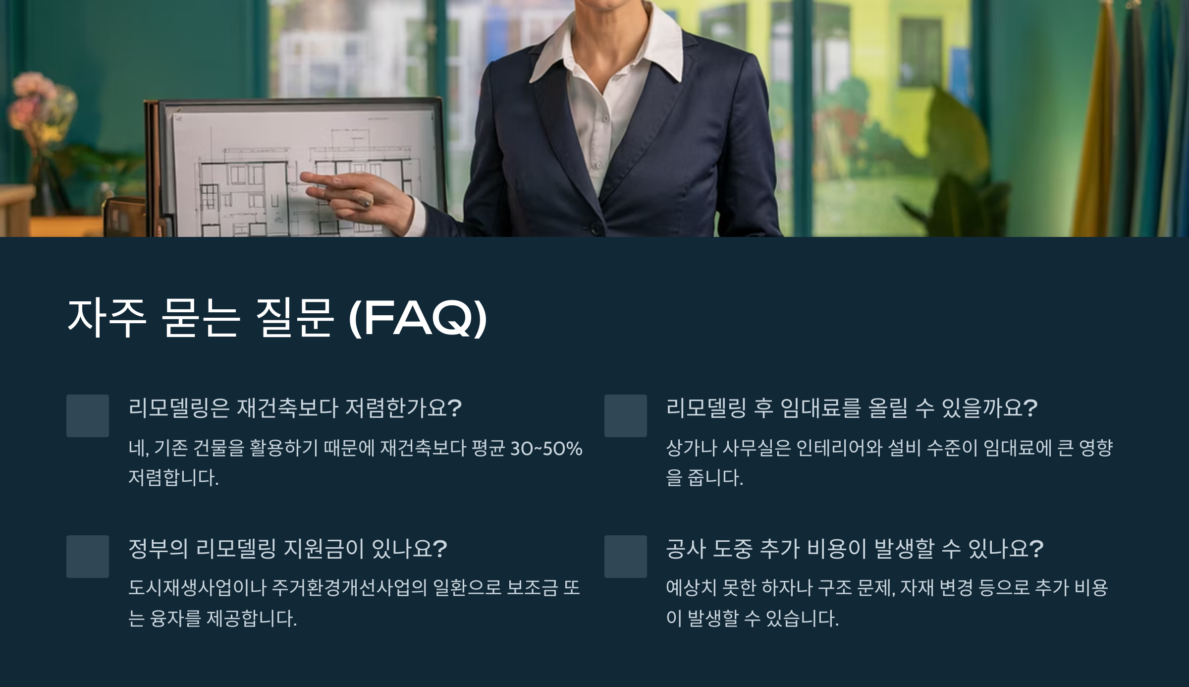 A1. 네, 일반적으로 리모델링은 기존 건물을 활용하기 때문에 재건축보다 평균 30~50% 저렴한 비용으로 가능합니다.