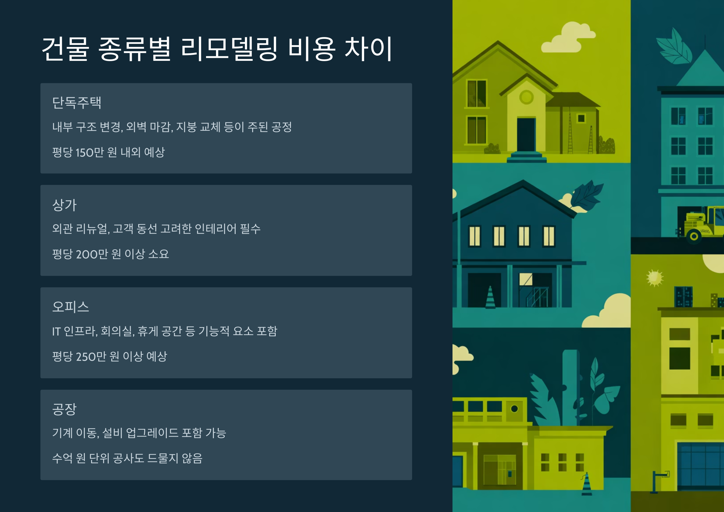 건물 리모델링 비용은 건물의 종류에 따라 큰 차이를 보여요. 단독주택과 상가, 오피스, 아파트, 공장 등 각각의 용도와 구조에 따라 공사 범위가 달라지기 때문이에요.