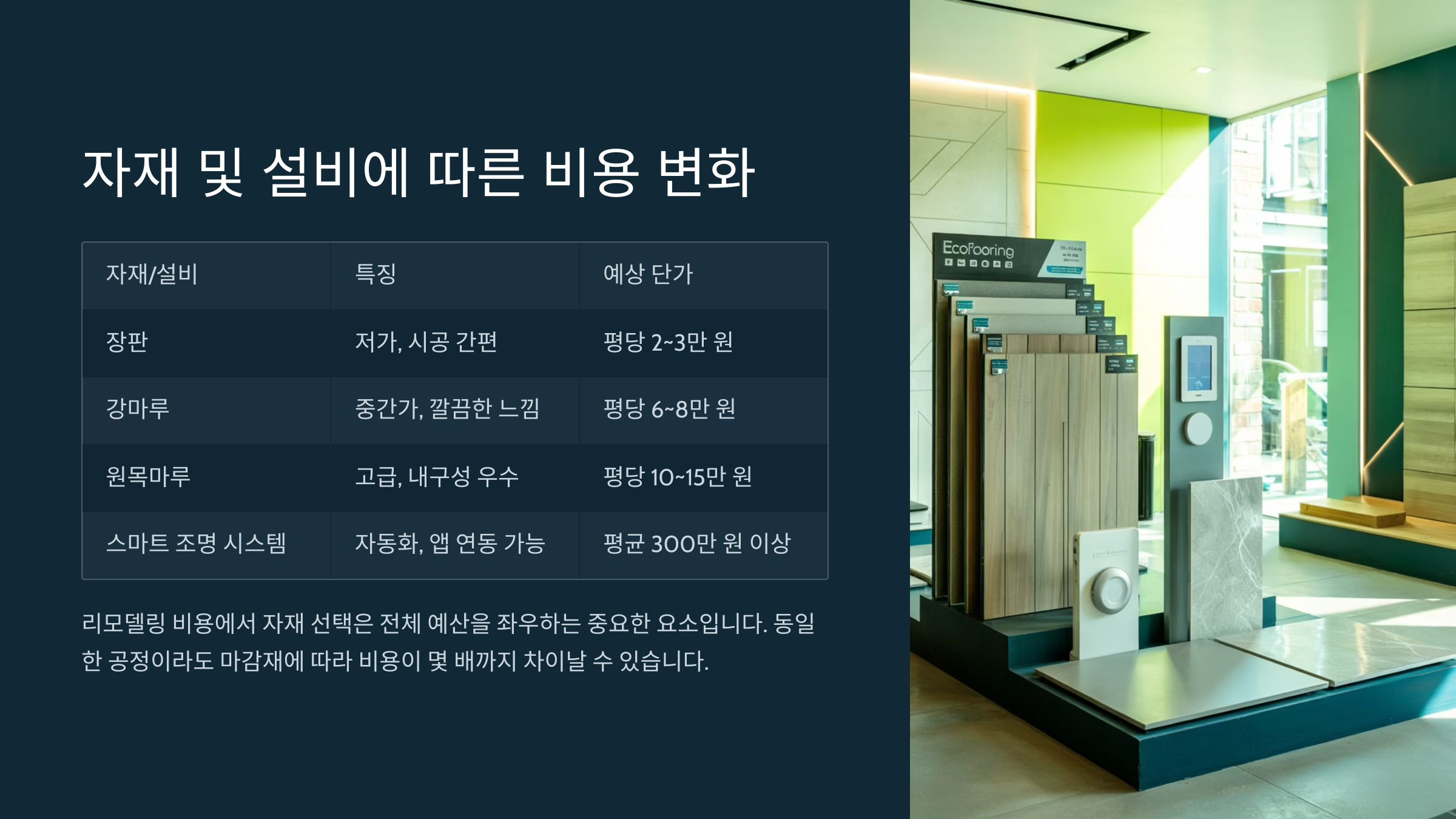 리모델링 비용에서 자재 선택은 전체 예산을 좌우할 정도로 중요한 요소예요. 동일한 공정이라도 어떤 마감재를 쓰느냐에 따라 비용이 몇 배까지 차이 나기도 하거든요.