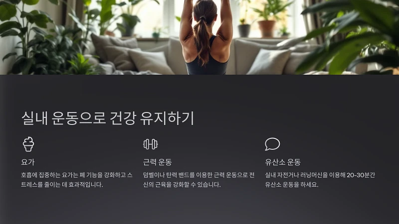 - 실내 운동은 건강을 유지하는 데 효과적입니다. 요가, 스트레칭, 또는 간단한 홈 트레이닝은 몸을 움직이는 좋은 방법입니다.
