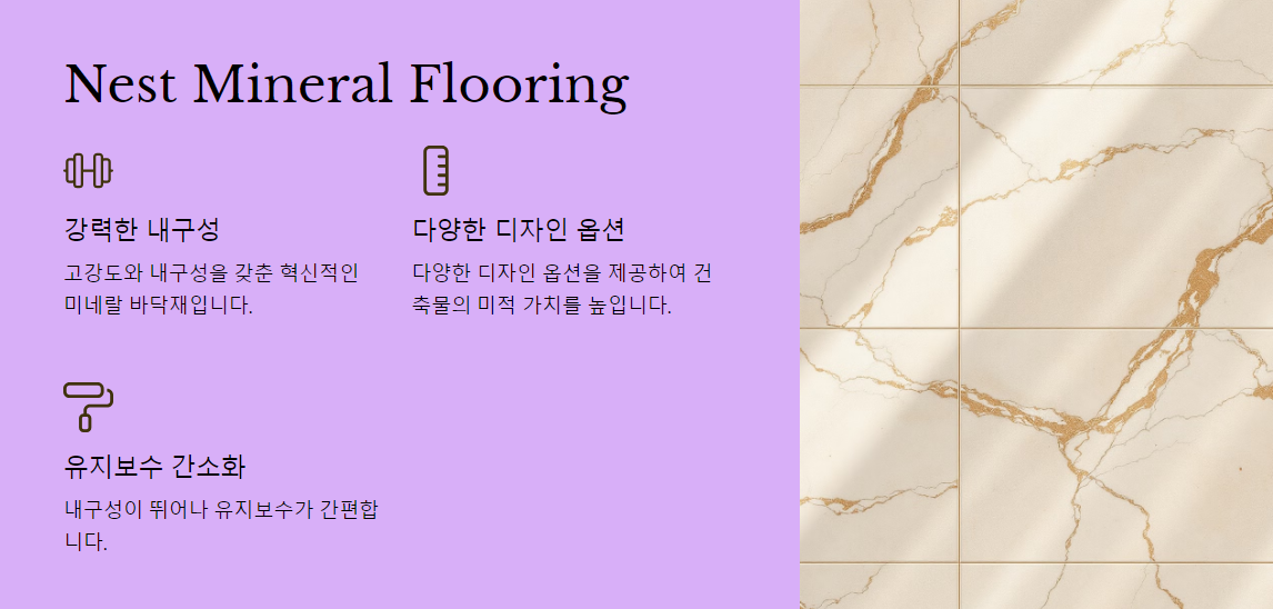 Nest Mineral Flooring은 고강도와 내구성을 갖춘 혁신적인 미네랄 바닥재입니다. 방수와 방화 기능을 겸비해 현대 건축물에 이상적입니다.