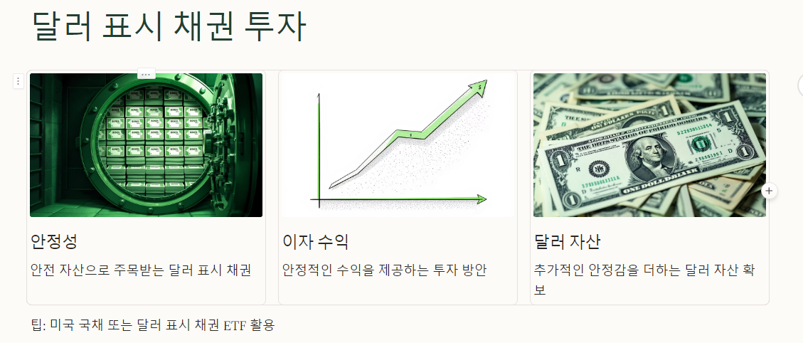 - 장점: 안정적인 이자 수익을 제공하며, 달러 자산을 보유함으로써 추가적인 안정감을 얻을 수 있습니다.