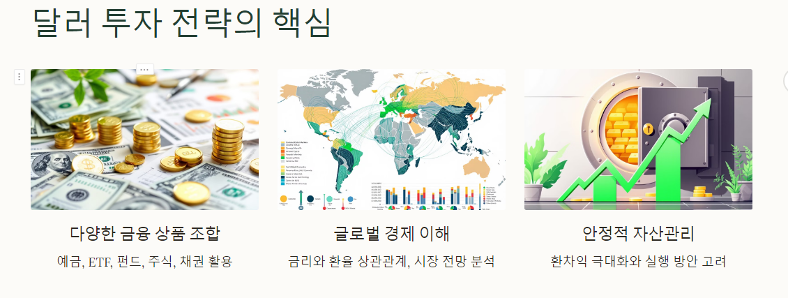 달러 투자 전략은 단순한 외환거래를 넘어 다양한 금융 상품과 포트폴리오를 포함합니다. 달러 예금, ETF, 펀드, 주식, 채권 등 여러 상품을 조합해 고환율의 특성을 효과적으로 활용할 수 있습니다. 이를 위해서는 글로벌 경제 흐름, 금리와 환율의 상관관계, 시장 전망에 대한 깊은 이해가 필수적입니다. 동시에, 안정적인 자산 관리와 함께 환차익을 극대화할 수 있는 실행 방안도 고려해야 합니다. 아래에서는 주요 투자 전략을 상세히 살펴보겠습니다.