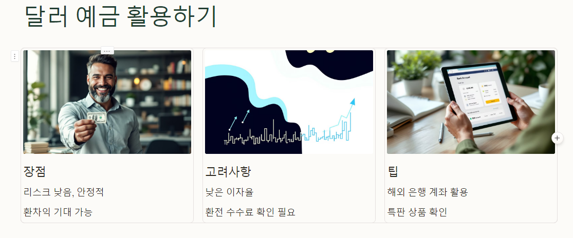 - 장점: 달러 예금은 비교적 리스크가 낮고 안정적이며, 고환율 환경에서 추가적인 환차익을 기대할 수 있습니다. 특히 환율이 높은 시점에 예금하면, 이후 환율 하락 시 원화로 전환해 차익을 실현할 수 있습니다.