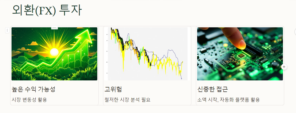 - 장점: 소액 투자로도 환율 변화에 따른 수익을 기대할 수 있으며, 리스크 관리가 비교적 용이합니다.