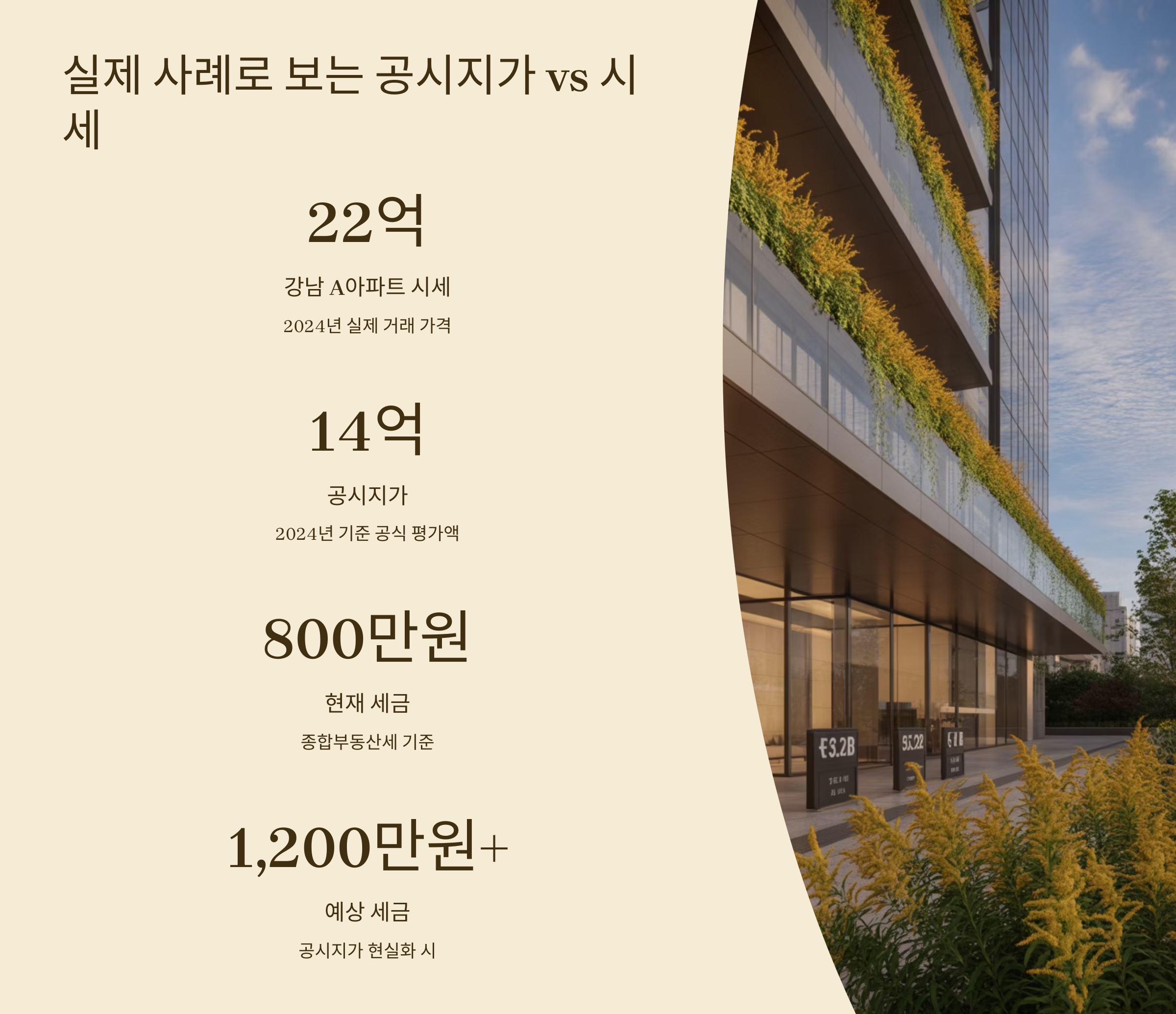 서울 강남의 A아파트는 시세가 22억 원 수준이에요. 하지만 2024년 기준 공시지가는 14억 원이었어요. 이 아파트 소유주는 종합부동산세 기준으로 약 800만 원을 납부했는데, 공시지가가 시세에 가깝게 조정되면 세금은 1,200만 원 이상으로 증가할 수 있어요.