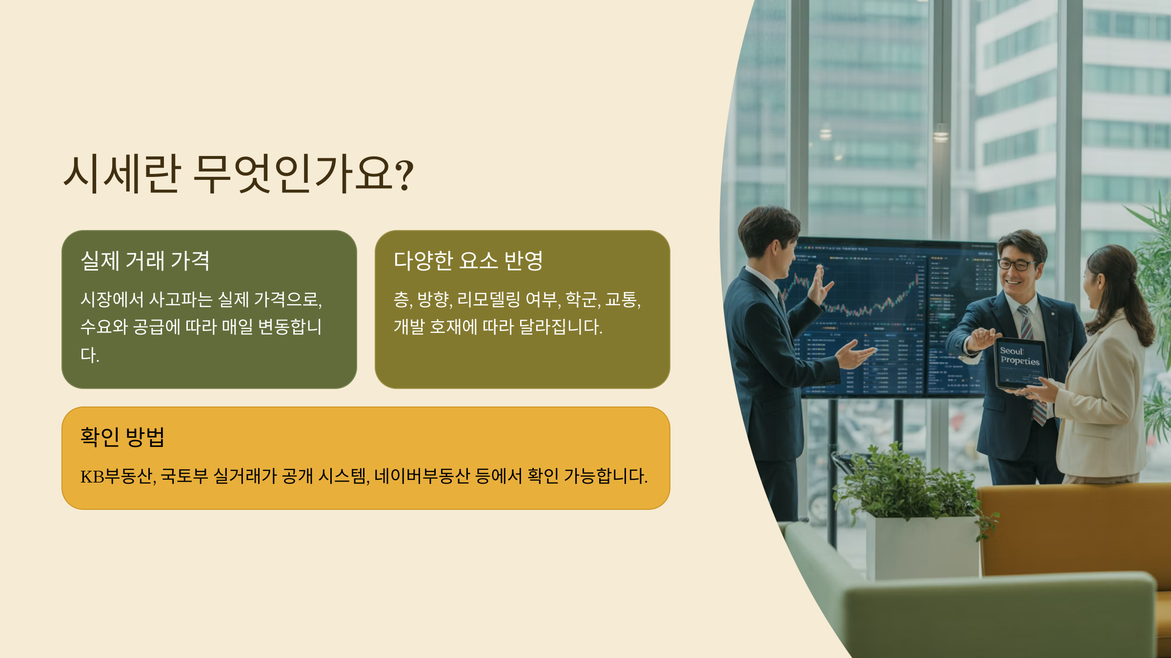 시세는 말 그대로 시장에서 거래되는 실제 가격이에요. 사람들이 사고파는 가격이 바로 시세이고, 수요와 공급에 따라 매일 변동해요. 부동산에서는 이 시세가 가장 현실적인 가격 기준으로 여겨지고 있죠.