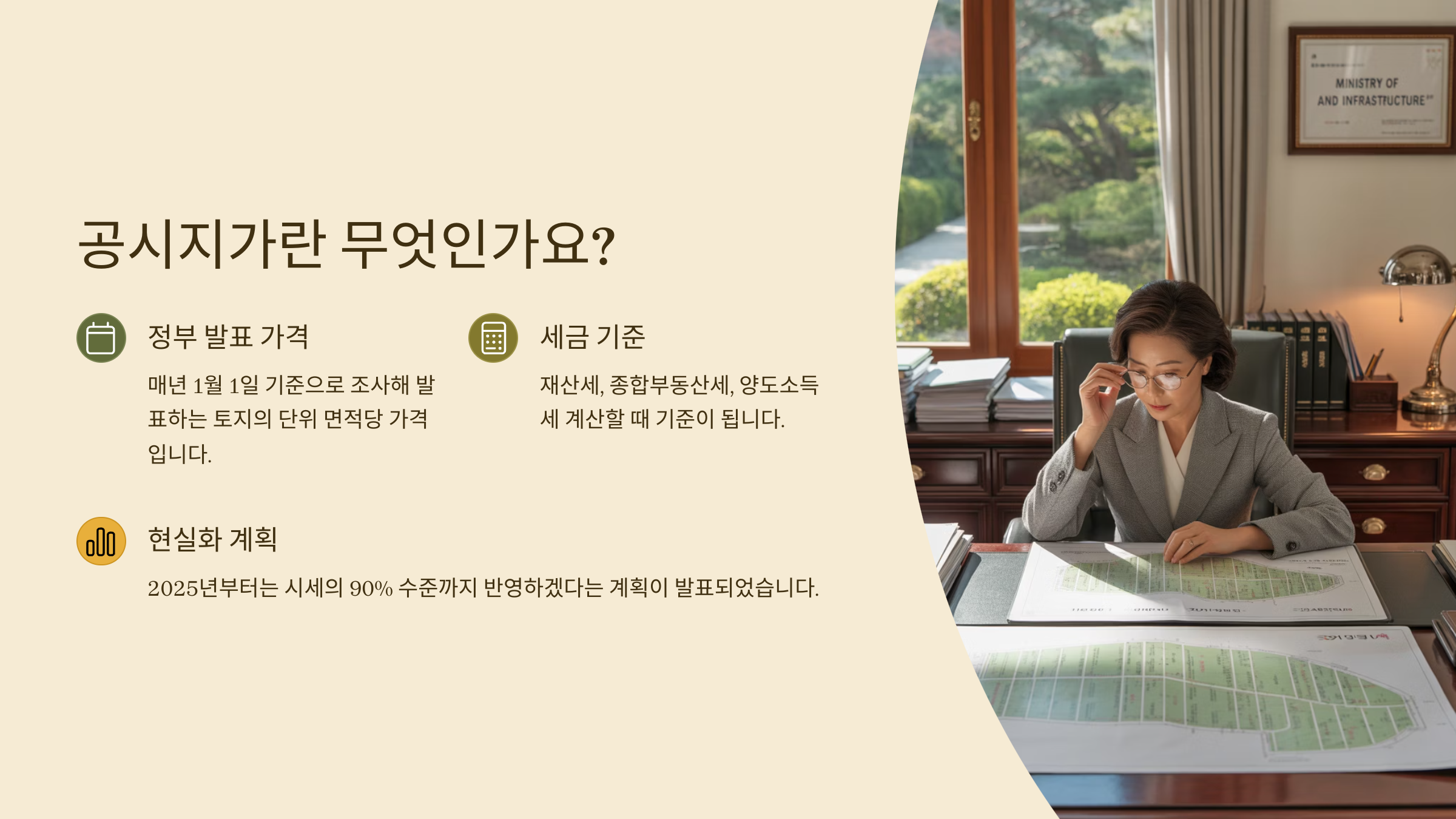공시지가는 정부가 매년 1월 1일 기준으로 조사해 발표하는 토지의 단위 면적당 가격이에요. 국토교통부와 지방자치단체가 협력해서 전국의 표준지와 개별지를 기준으로 정하는데요, 부동산 세금이나 각종 부담금의 기준이 되는 아주 중요한 수치랍니다.