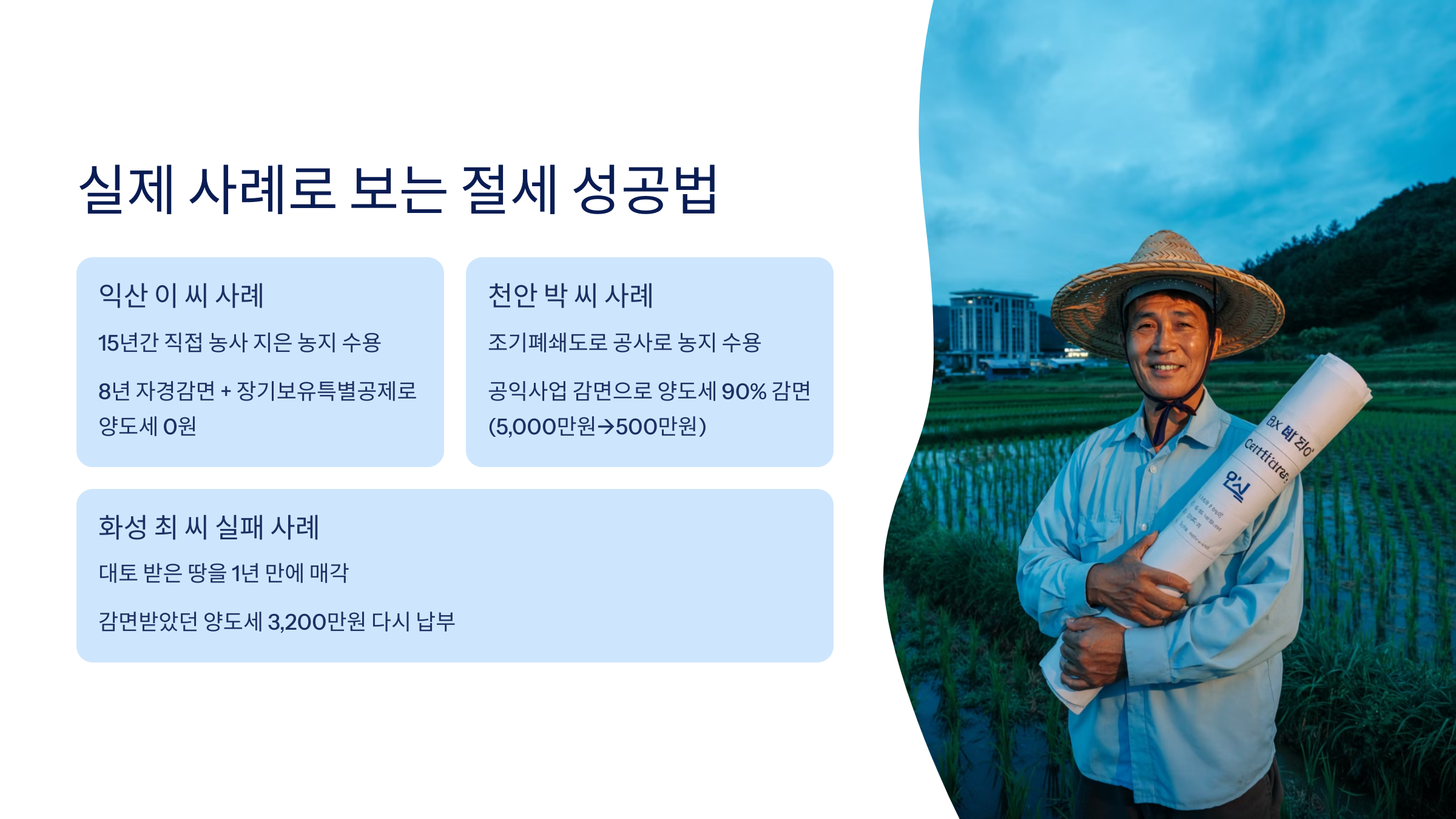 전북 익산에 거주하던 이 모 씨는 약 15년간 직접 농사를 지어온 농지를 산업단지 조성으로 수용당했어요. 대토 보상으로 인근 농지를 받고, 8년 자경감면과 장기보유특별공제를 동시에 신청했어요. 농지원부와 농협 통장, 마을이장 확인서 등 철저한 증빙으로 양도세가 0원이 됐어요!