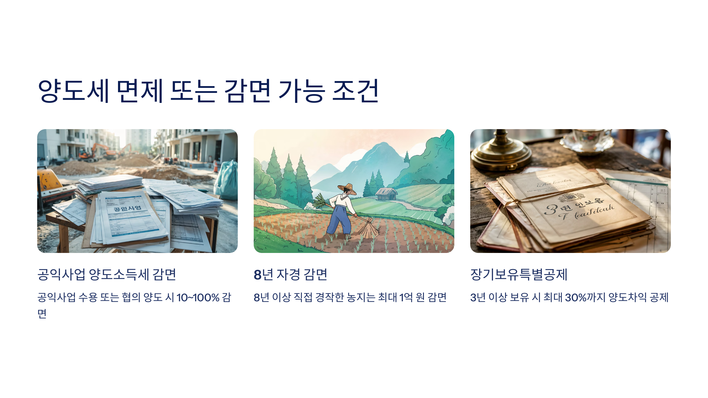 두 번째는 8년 자경 감면</strong이에요. 농지의 경우, 본인이 직접 8년 이상 경작한 사실이 인정되면 최대 1억 원까지 양도세를 감면받을 수 있어요. 단, 증빙자료가 확실해야 하며, 최근 2년간 실경작 여부도 중요하게 봐요.