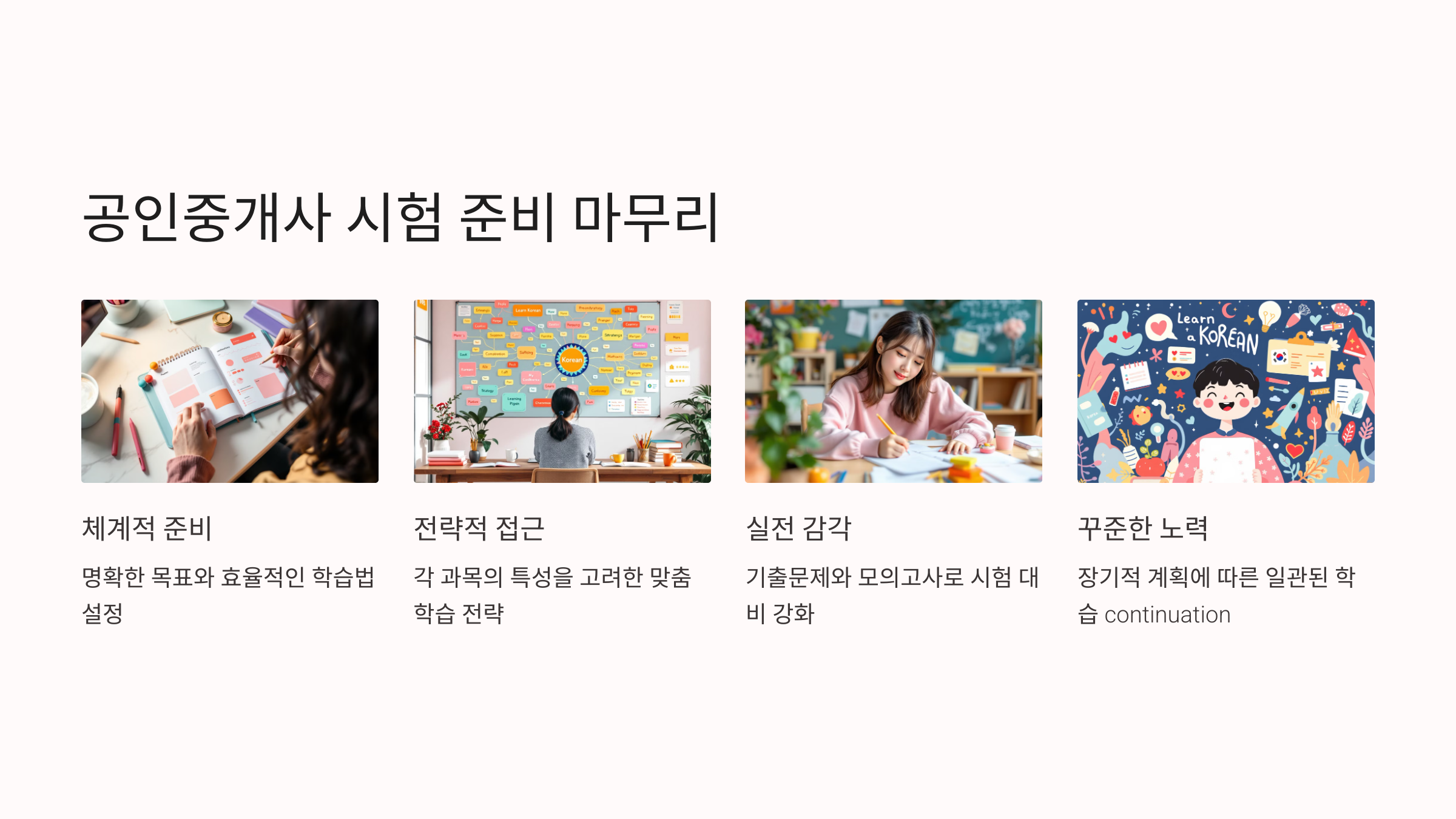 하지만 이 시험은 체계적인 준비와 전략이 꼭 필요한 시험으로 잘 알려져 있어요. 시험 범위가 방대하기 때문에 단순히 시간을 투자하는 것만으로는 합격하기 어려운 시험 중 하나랍니다. 제가 생각했을 때, 공인중개사 시험을 제대로 준비하려면 명확한 목표와 효율적인 학습법이 필요하다고 느껴져요.