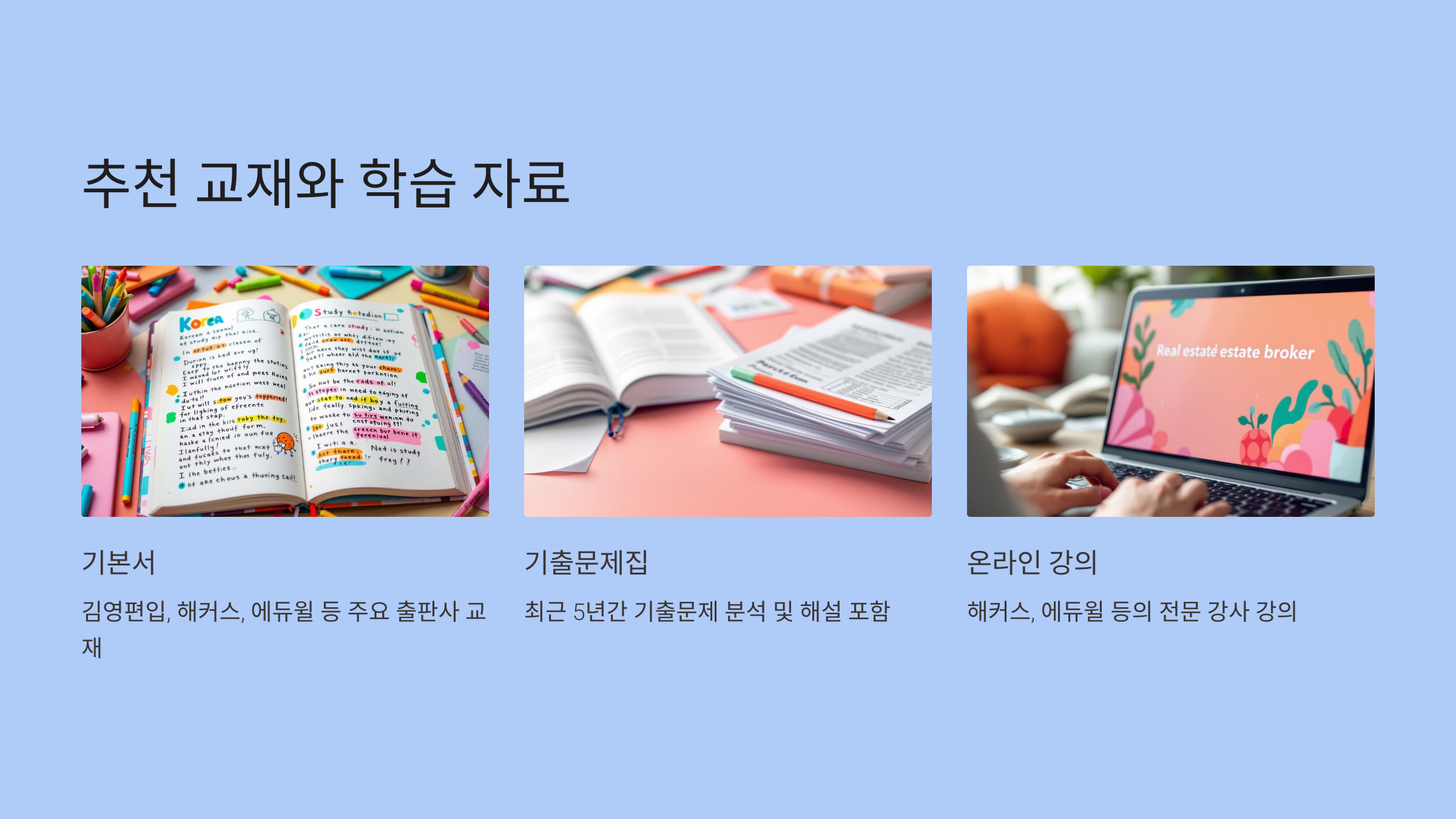 공인중개사 시험 준비를 위한 교재는 시장에 다양하게 나와 있어요. 기본서는 김영편입, 해커스, 에듀윌 등 주요 출판사의 교재를 추천드려요. 이들 교재는 체계적인 내용 구성과 기출문제 풀이를 제공해 수험생들이 많이 선택하는 편이에요.