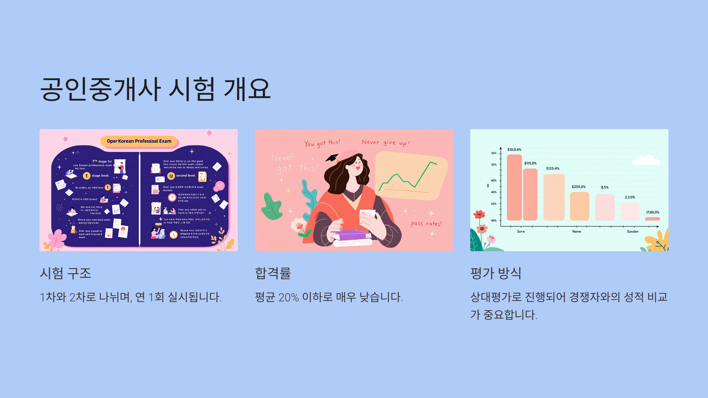 공인중개사 시험은 부동산 중개 및 관련 업무를 수행하기 위한 필수 자격증이에요. 시험은 연 1회 실시되며, 합격 시 공인중개사 자격증을 취득해 부동산 중개업 등록을 할 수 있는 자격을 얻게 돼요.