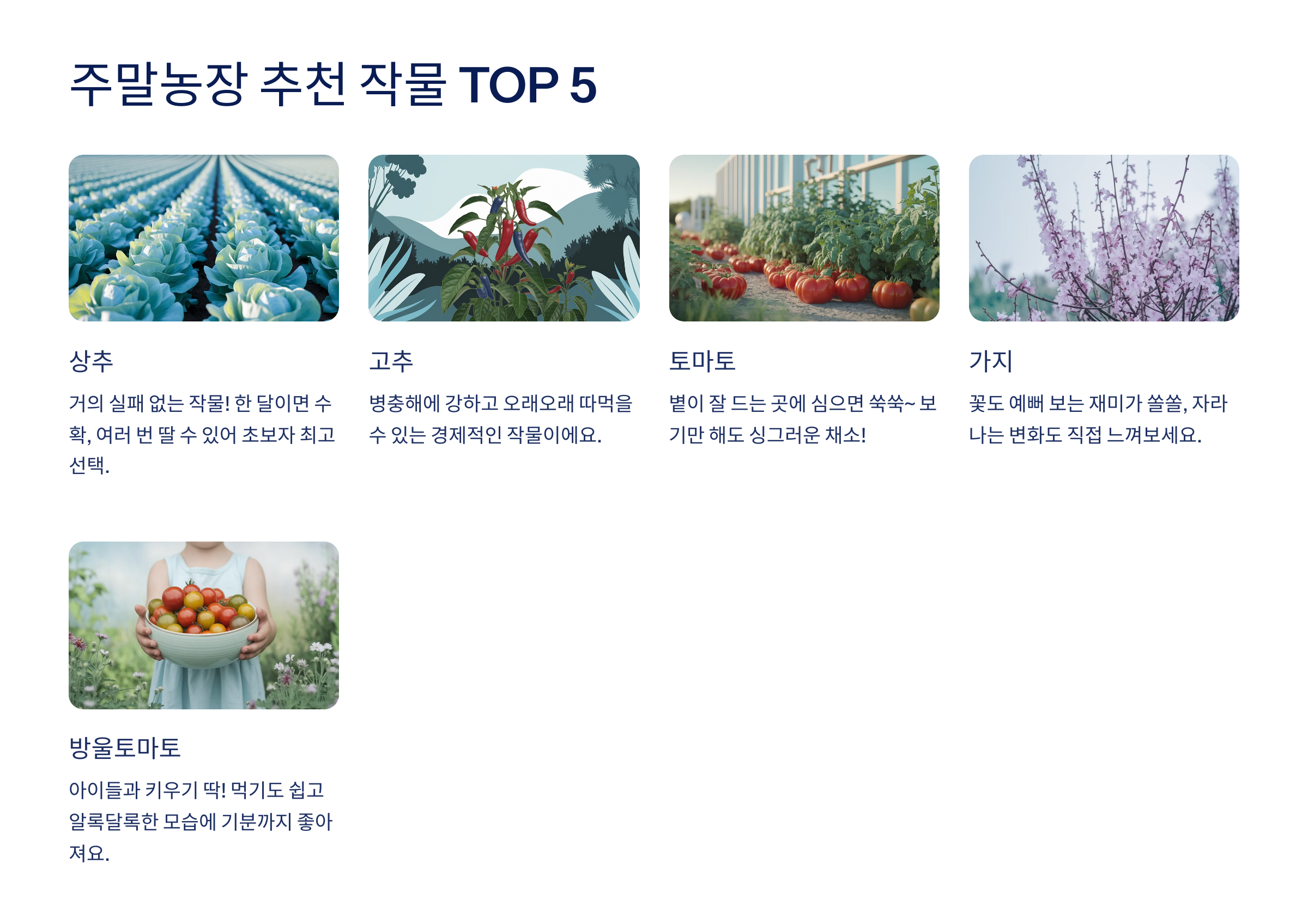 이제 다음 섹션에서 ‘주말농장 시작하는 법’, ‘추천 작물 TOP 5’까지 이어서 안내할게요! 🔧🍅 계속해서 복사해서 확인해주세요!