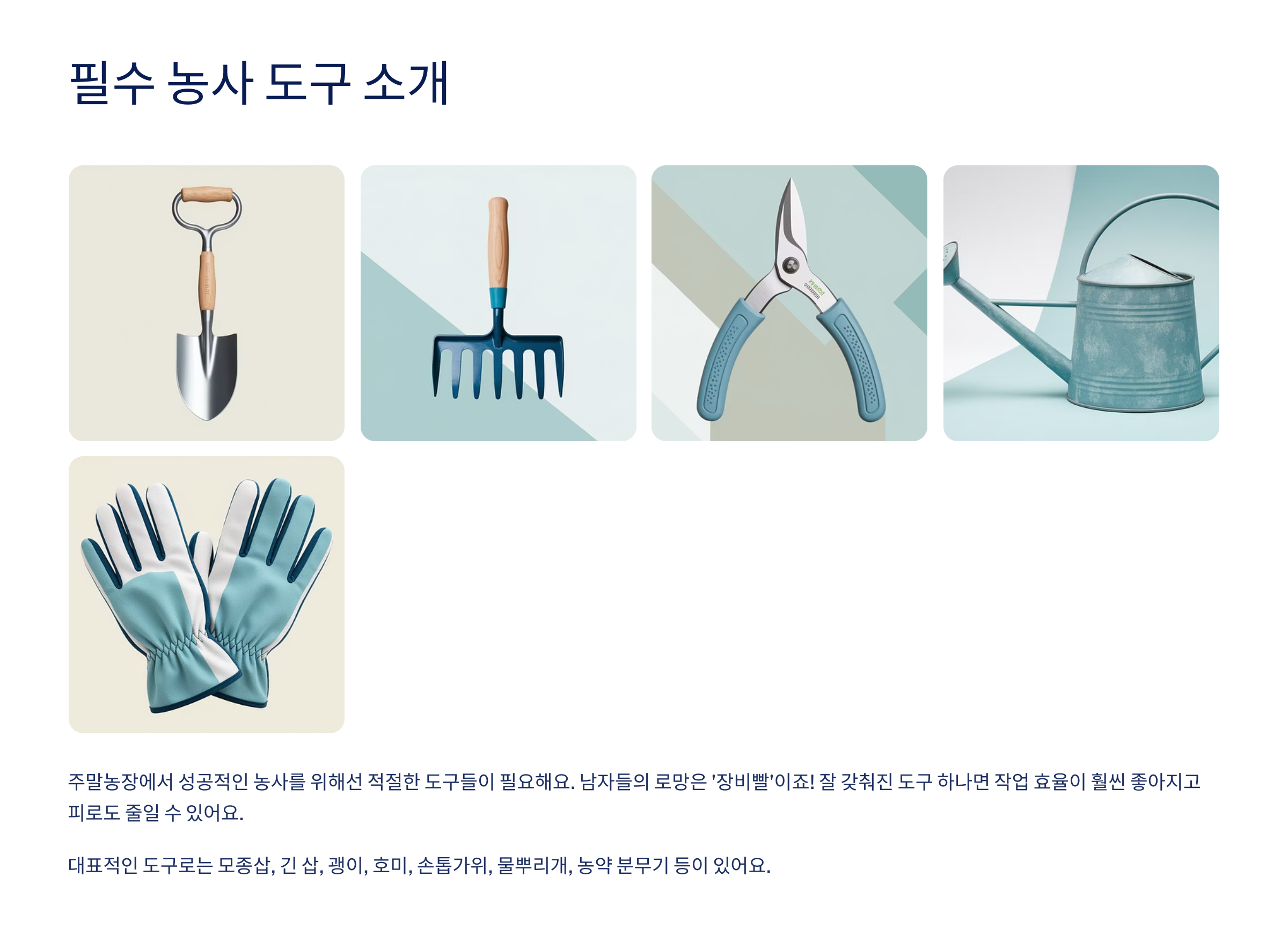 이제 도구와 커뮤니티 이야기를 남겨두고 있어요! 🌽 남자들의 농사, 그 감성과 장비는 빠질 수 없죠. 다음에서 계속 이어집니다.