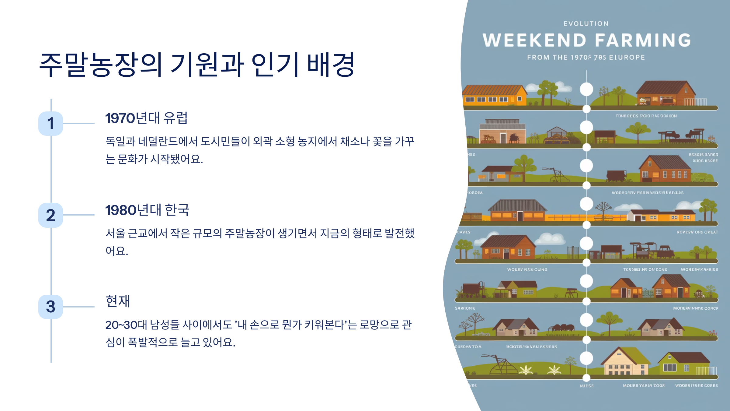 주말농장의 개념은 1970년대 유럽에서 시작됐다고 해요. 특히 독일과 네덜란드에서 도시민들이 일주일에 한두 번 외곽에 있는 소형 농지에서 채소나 꽃을 가꾸는 문화가 생겨났죠. 이 흐름은 곧 한국에도 들어왔고, 1980년대 후반 서울 근교에서 작은 규모의 주말농장이 생기면서 지금의 형태로 발전하게 됐답니다.