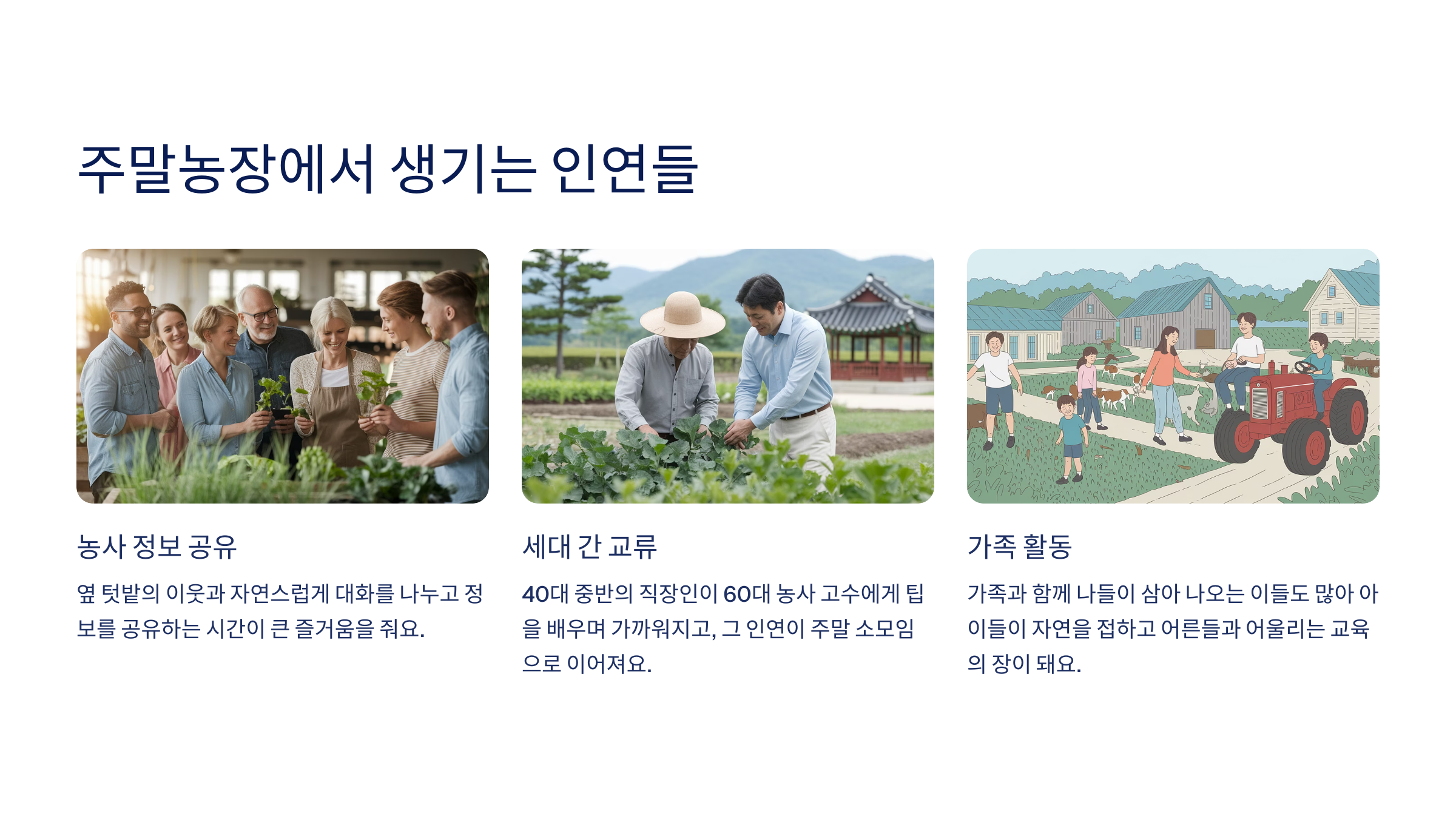 같은 작물을 키우며 생기는 공감대, 함께 땀 흘리며 느끼는 유대감은 예상치 못한 인연으로 발전하기도 해요. 40대 중반의 직장인이 60대 농사 고수에게 팁을 배우며 가까워지고, 그 인연이 주말 소모임으로 이어지는 경우도 많아요.