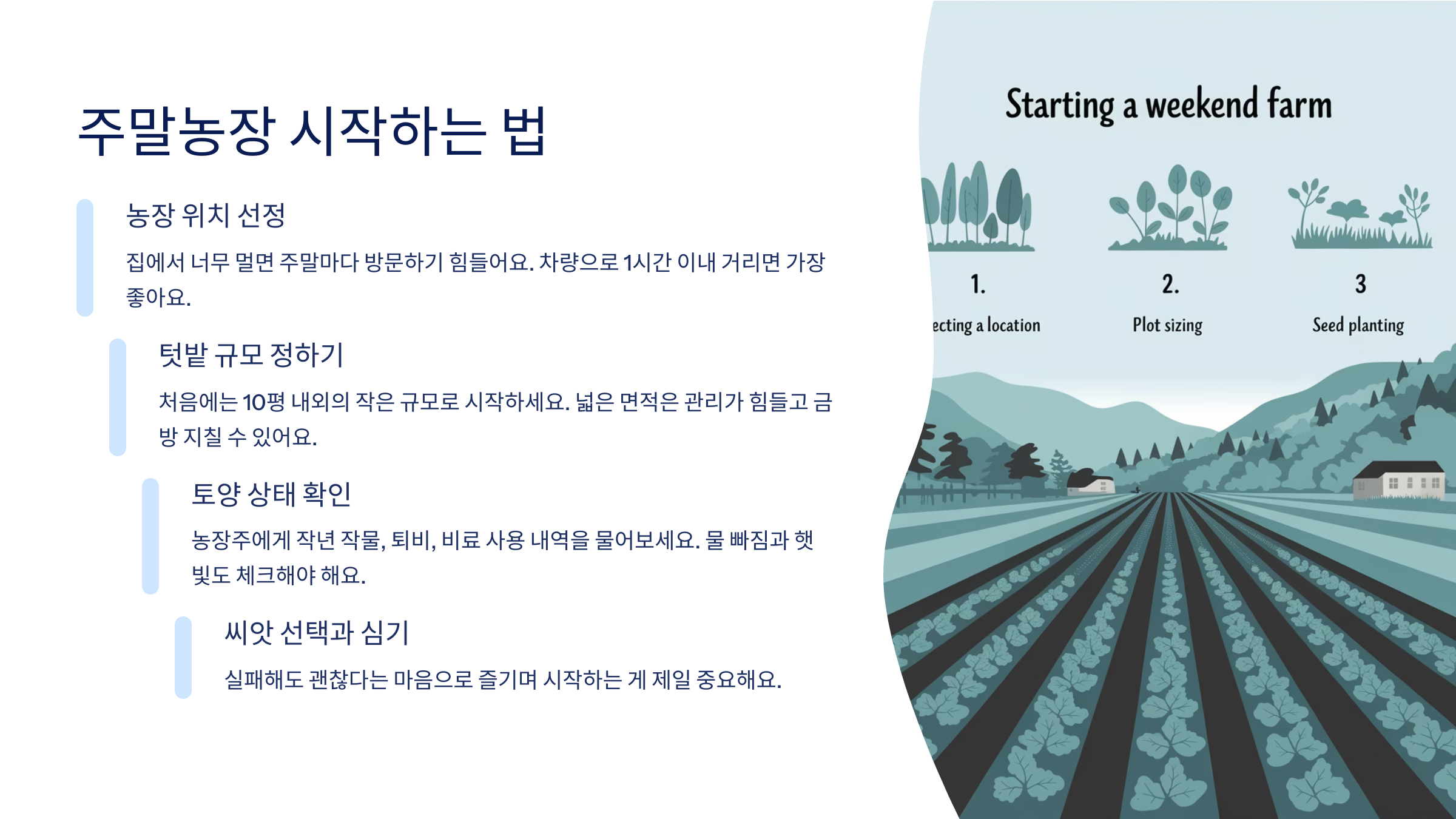 처음 주말농장을 시작할 땐 막막할 수 있지만, 차근차근 준비하면 누구나 도전할 수 있어요. 우선 가장 먼저 할 일은 농장 위치 선정이에요. 집에서 너무 멀면 주말마다 방문하기 힘들기 때문에, 차량으로 1시간 이내 거리면 가장 좋아요.