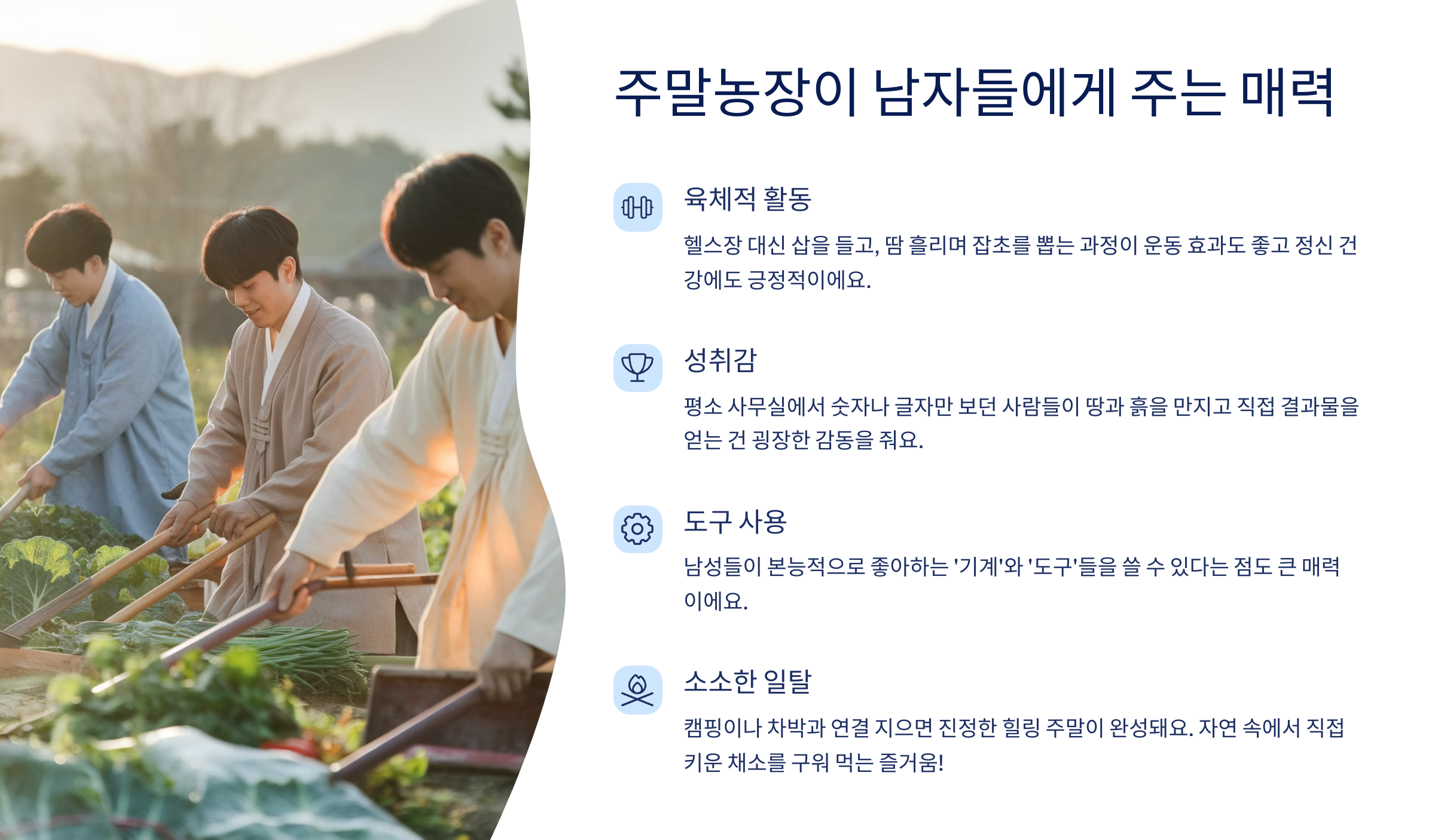 최근에는 단순한 취미를 넘어서 삶의 일부가 된 주말농장. 특히 남자들 사이에서는 스트레스를 날리고 성취감을 얻는 방법으로 인기를 끌고 있어요. 땀 흘리며 자연과 교감하는 그 느낌, 해본 사람만 알아요 🍀