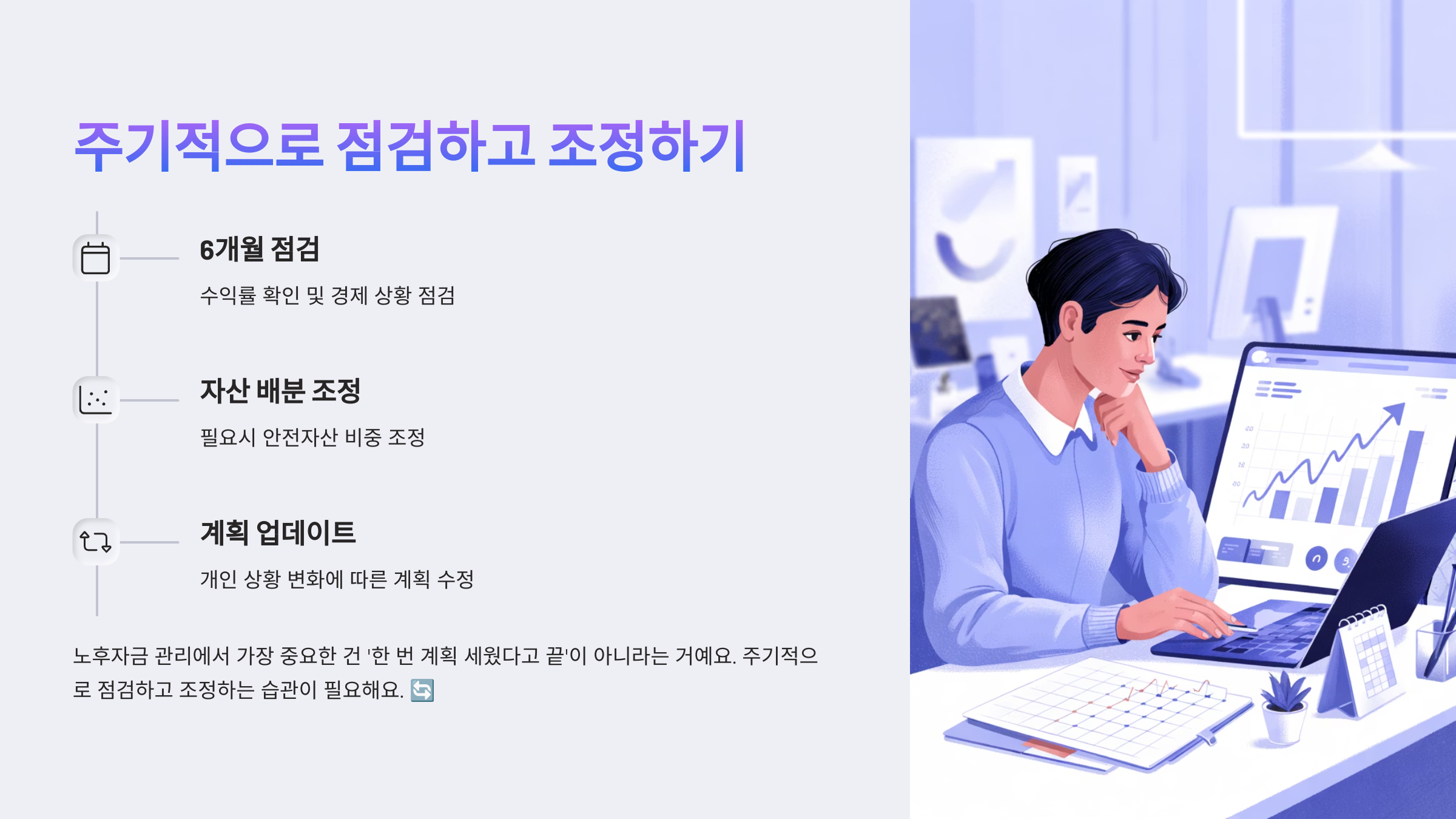 노후자금 관리에서 가장 중요한 건 '한 번 계획 세웠다고 끝'이 아니라는 거예요. 주기적으로 점검하고 조정하는 습관이 필요해요. 🔄