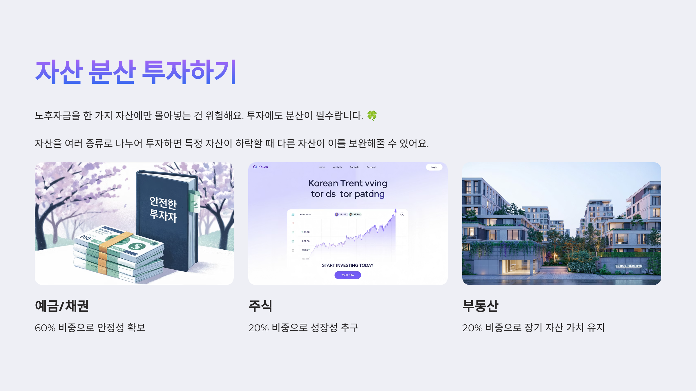 노후자금을 한 가지 자산에만 몰아넣는 건 위험해요. 투자에도 분산이 필수랍니다. 🍀