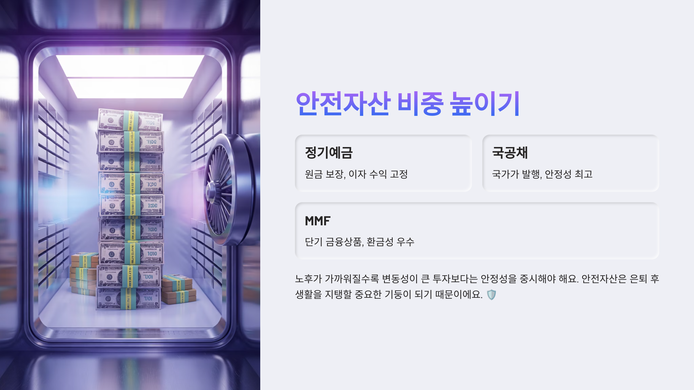 노후가 가까워질수록 변동성이 큰 투자보다는 안정성을 중시해야 해요. 안전자산은 은퇴 후 생활을 지탱할 중요한 기둥이 되기 때문이에요. 🛡️