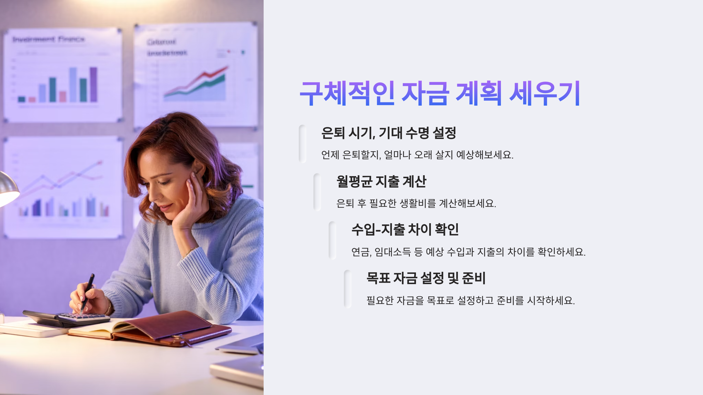 1단계: 예상 은퇴 시기와 기대 수명을 설정해요. 2단계: 은퇴 후 월평균 지출 예상 금액을 계산해요. 3단계: 예상 수입(연금, 임대소득 등)과 지출의 차이를 확인해요. 4단계: 필요한 자금을 목표 금액으로 설정하고 준비를 시작해요.