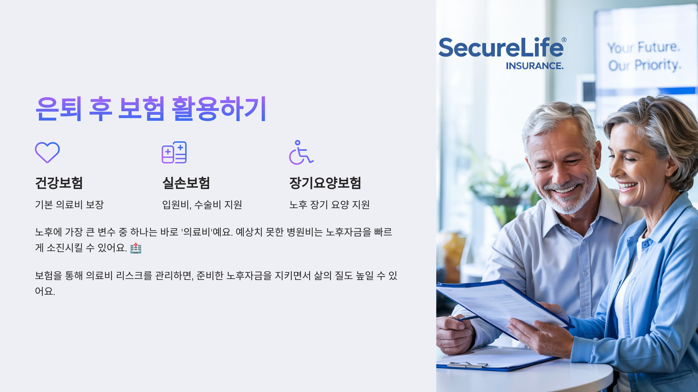 보험을 통해 의료비 리스크를 관리하면, 준비한 노후자금을 지키면서 삶의 질도 높일 수 있어요.