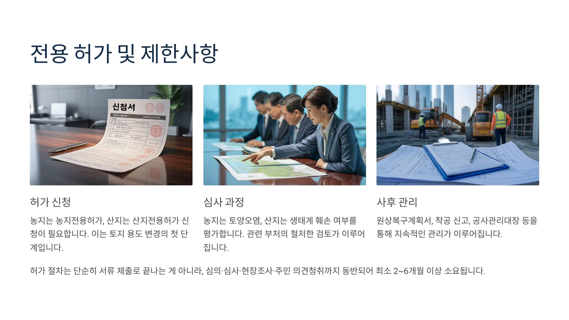 농지와 산지를 각각 다른 목적으로 사용하려면 '전용 허가'라는 절차를 밟아야 해요. 이 절차는 굉장히 엄격하며, 허가 기준도 까다로워요. 특히 무단 전용 시에는 복구 명령과 함께 형사 처벌까지 이어질 수 있어요.