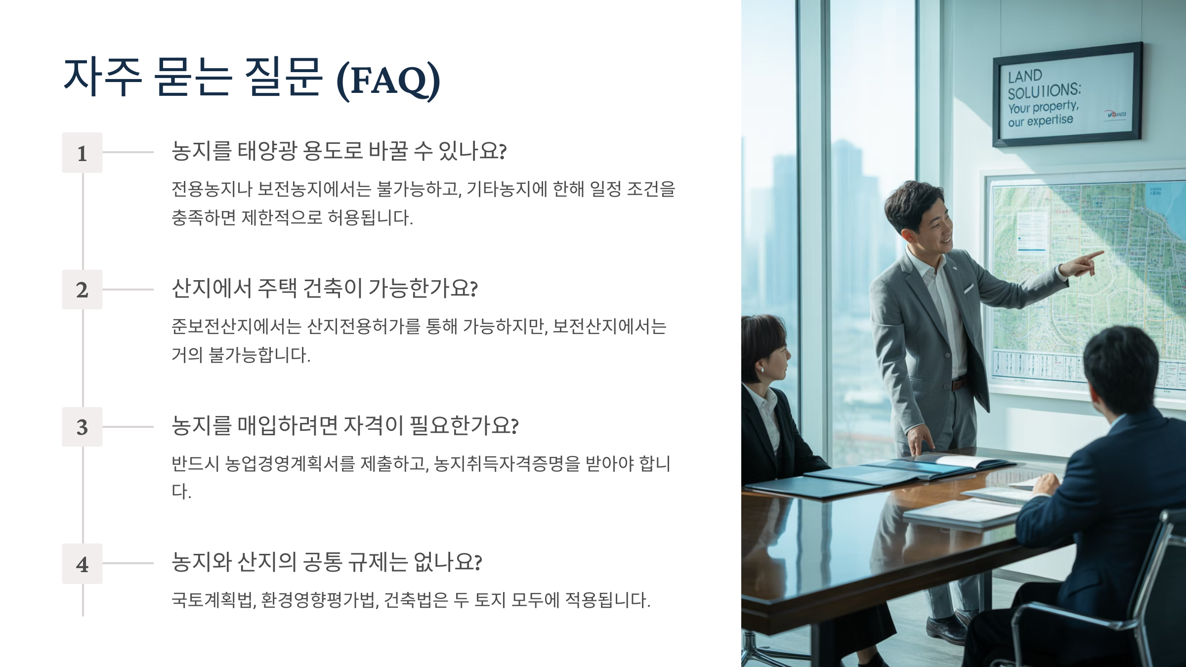 결론적으로 말하면, 농지는 ‘인간 중심’, 산지는 ‘자연 중심’의 접근법을 가진다고 볼 수 있어요. 이 차이를 정확히 인식하고 접근하면 불필요한 행정 낭비를 줄이고, 성공적인 토지 개발이 가능해진답니다. 🤓