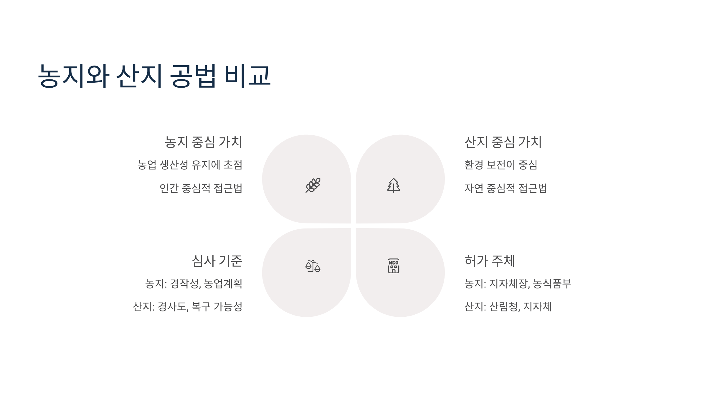 | 중점 가치 | 농업 생산성 유지 | 생태 보전 |