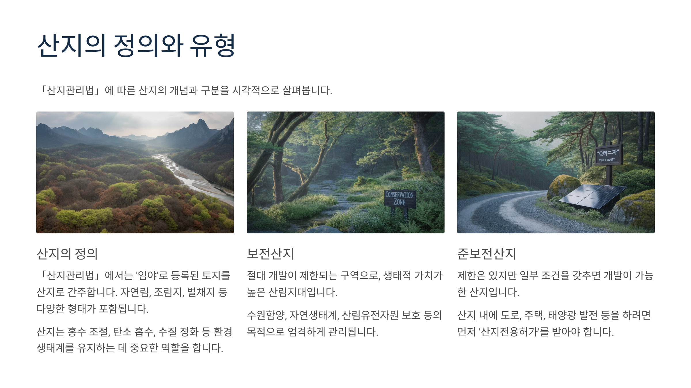 이처럼 산지는 다층적이고 복합적인 공법 구조로 관리돼요. 단순한 허가 절차가 아닌, 환경과 생태, 사회적 영향을 고려하는 체계적 계획이 중요하답니다.