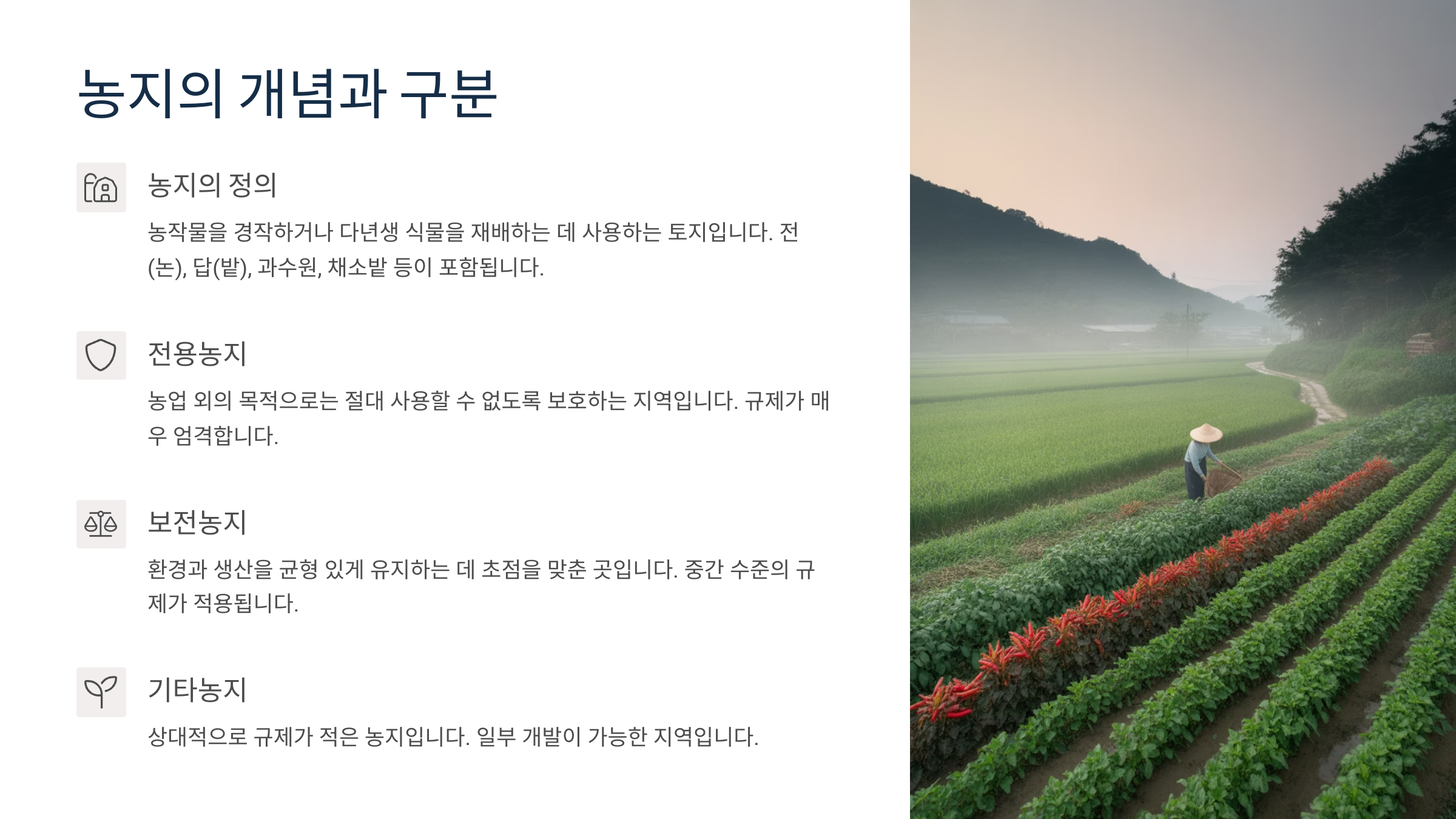 농지와 산지는 우리나라 토지의 핵심적인 두 축이에요. 이 두 용도지역은 서로 다른 공법 체계에 따라 관리되고 있으며, 각기 다른 규제를 받아요. 그래서 개발이나 이용 계획을 세울 때 반드시 관련 법령을 이해하고 있어야 해요.