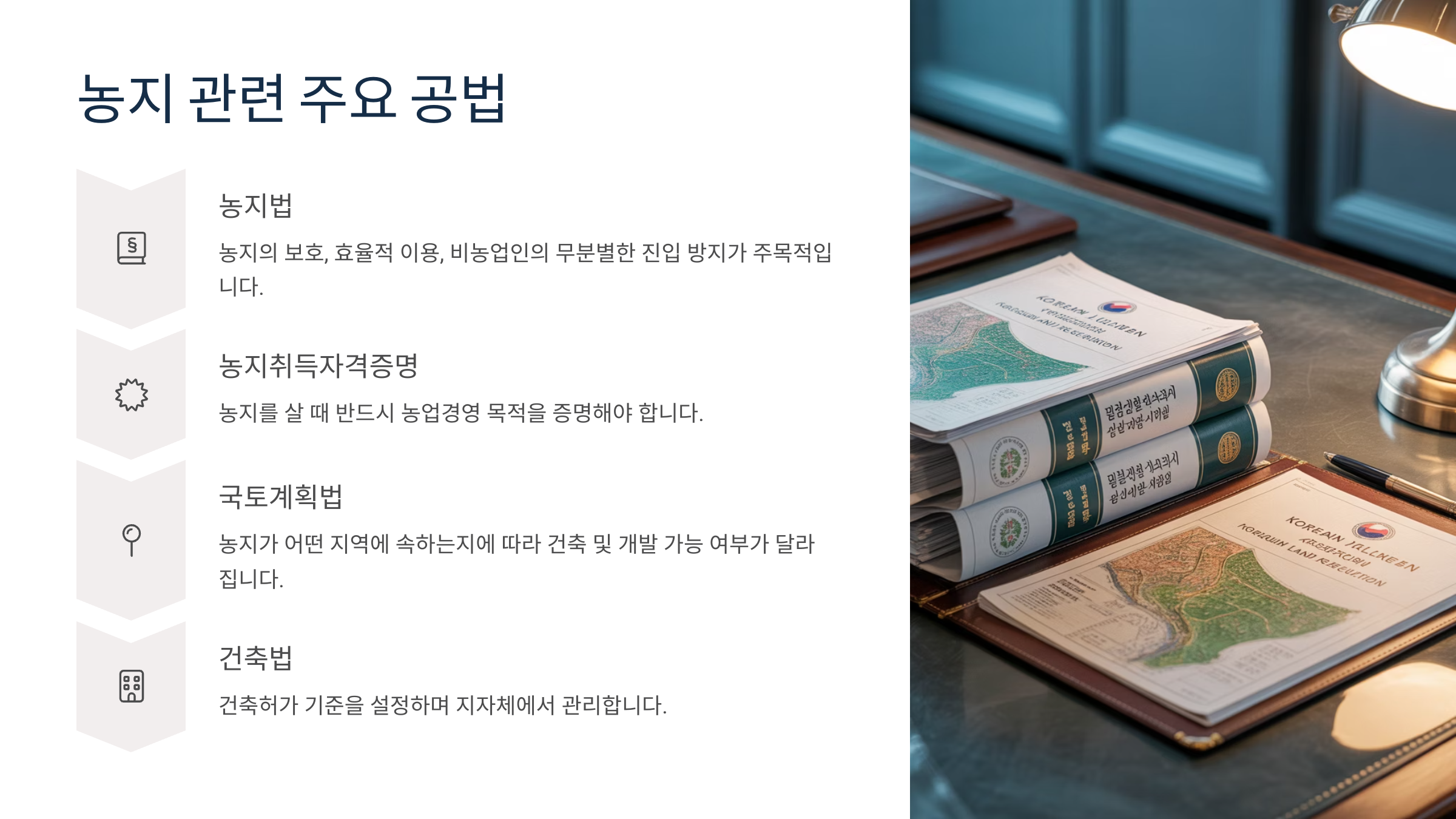 농지를 둘러싼 공법은 복잡하지만, 핵심은 「농지법」을 중심으로 구성돼요. 이 법은 농지의 보호, 효율적인 이용, 비농업인의 무분별한 진입 방지를 주목적으로 해요. 따라서 농지의 보전과 전용은 매우 엄격하게 규제돼요.
