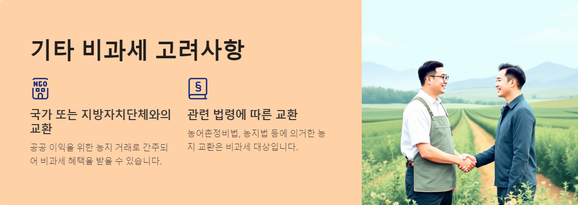 해당 법령에 따른 교환 절차를 준수하면 불필요한 세금 문제를 피할 수 있습니다. 특히 농업 활성화와 관련된 교환일 경우, 추가적인 지원 정책이 적용될 가능성도 있으니 사전에 확인이 필요합니다.