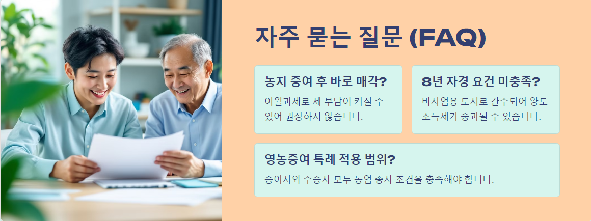 - 영농증여 특례 적용 시 주의: 영농 요건을 충족하지 못하면 감면 혜택이 사라지고, 추징세가 발생할 수 있습니다.