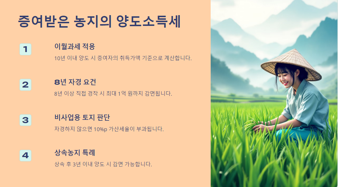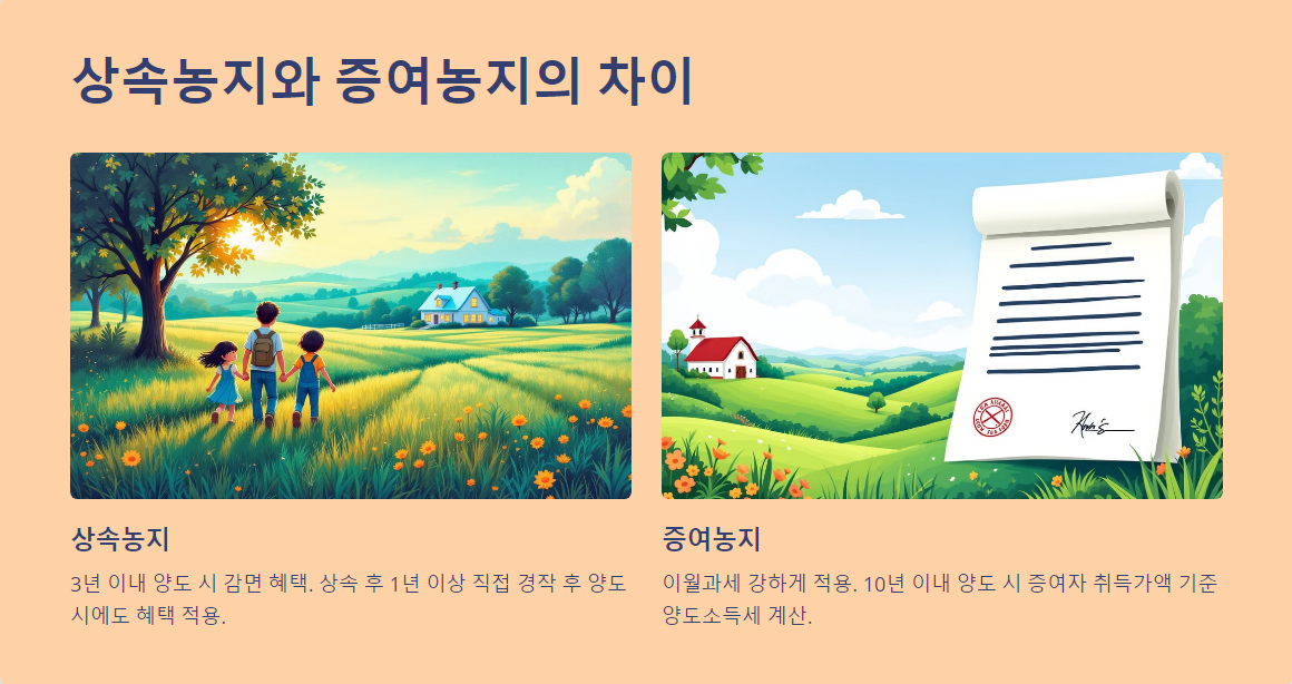 상속농지는 3년 이내 양도 시 감면 혜택이 있지만, 증여농지는 이월과세 요건이 강하게 적용됩니다.