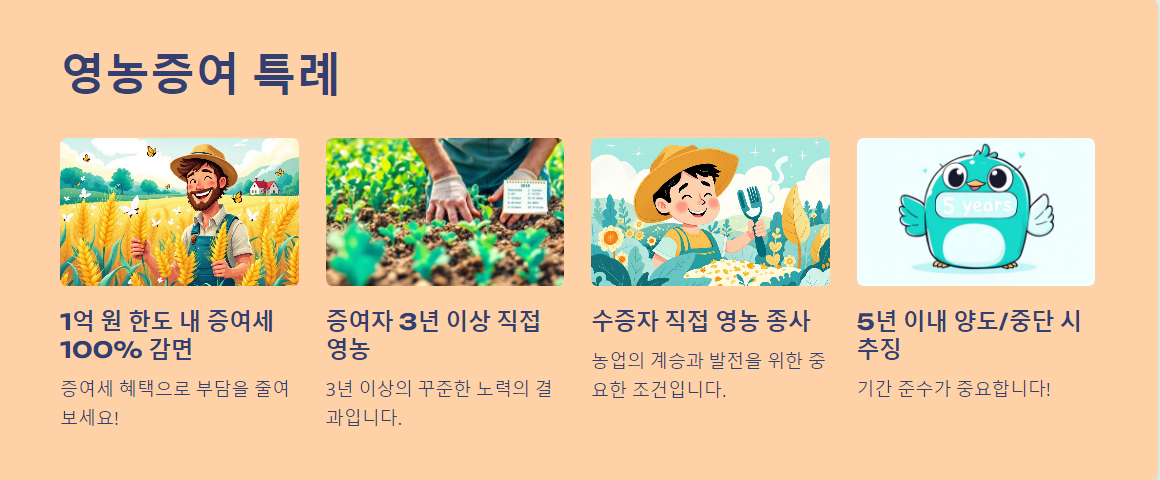 - 증여자 요건: 증여자가 3년 이상 직접 영농에 종사해야 함