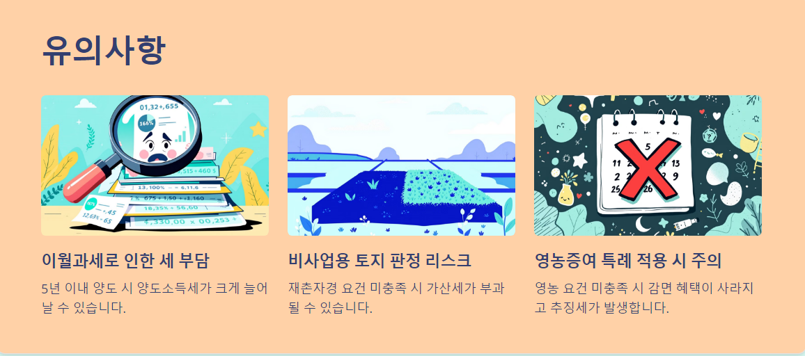 - 비사업용 토지 판정 리스크: 재촌자경 요건이 충족되지 않으면 가산세가 부과될 수 있습니다.